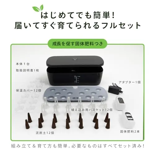 仕様と使用方法 軽量で扱いやすく、最大12ポットの栽培が可能。水と栄養を与え、バスケットにセットすれば準備完了です。説明書に沿って進めれば誰でも簡単に始められるため、ギフトや新生活アイテムとしてもおすすめです。