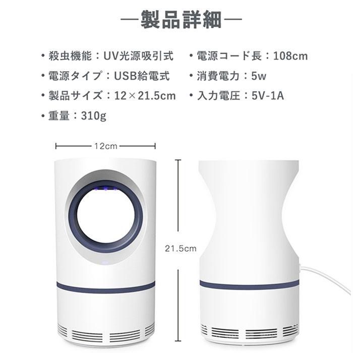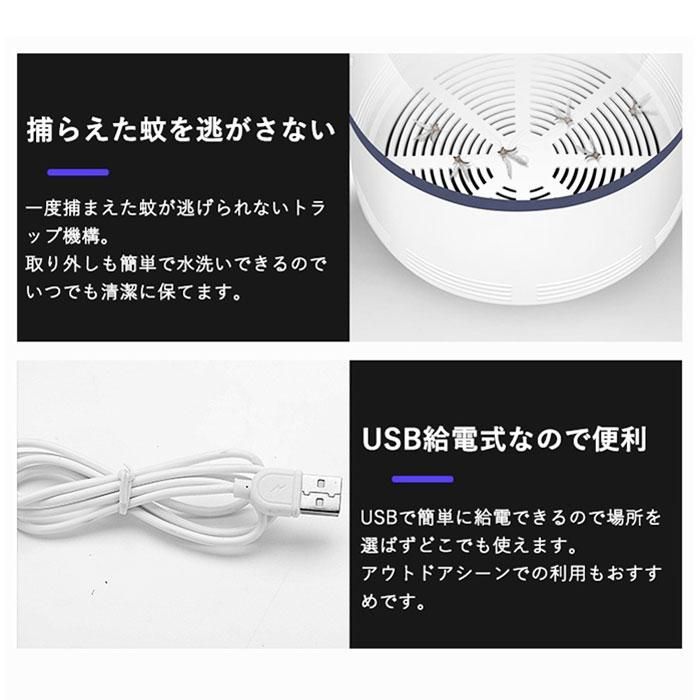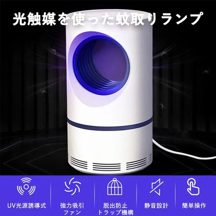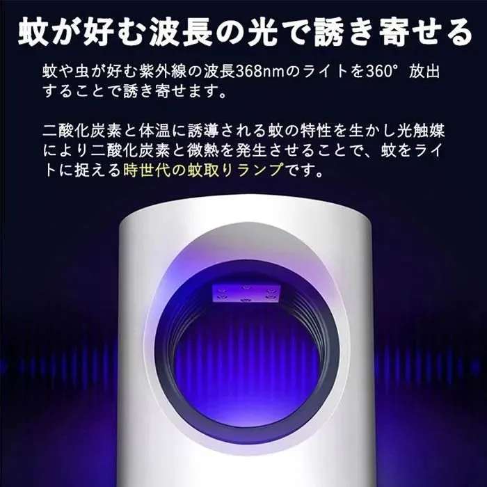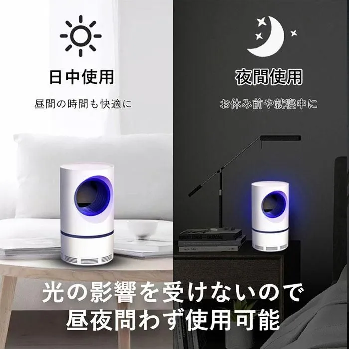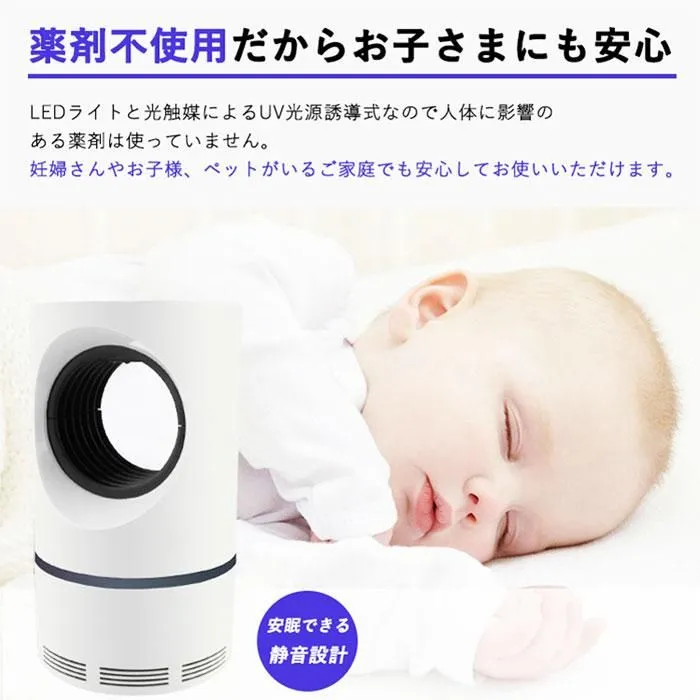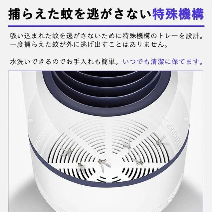 【薬剤不使用だから安心】 LEDライトと光触媒によるUVランプによる光源誘導式の蚊取り器なので人体に影響のある薬剤は使っていません。 妊婦さんやお子様、ペットがいるご家庭でも安心してお使いいただけます。 また吸い込んだ蚊を逃がさないために特殊トラップ機構のトレーを設計。 一度捕らえた蚊が外に逃げ出すことはありません。 取り外しも簡単で水洗いできるのでお手入れも簡単な蚊取り機。いつでも清潔に保てます。
