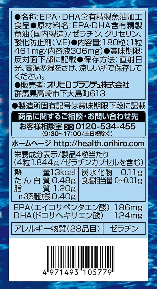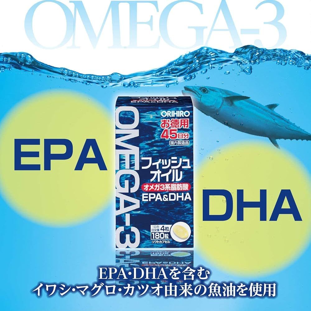●のどに詰まる恐れがありますので、小さなお子様へのご利用は控えてください。 △食生活は、主食、主菜、副菜を基本に、食事のバランスを。 原材料・成分 EPA・DHA含有精製魚油(国内製造)/ゼラチン、グリセリン、酸化防止剤(V.E) 「主な仕様」オリヒロ フィッシュオイル (EPA/DHA) 180粒×3 合計540錠 [EPA・DHA] T.L.Sオリジナルレジ袋をプレゼント(2枚目の画像) EPA・DHAを含むイワシ・マグロ・カツオ由来の魚油を魚の苦手な方にもご利用しやすいようソフトカプセルに詰めた食品です。食事の偏りが気になる方や魚嫌いの方、健康が気になる方などの栄養補助食品としてお召し上がりください。
