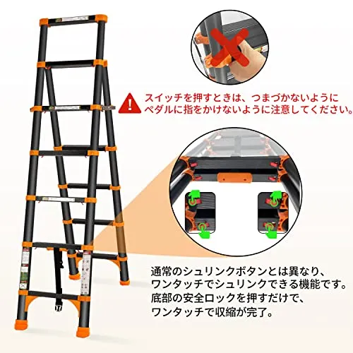【ワンタッチで高さ調整&超安定】このはしごは通常のボタンとは異なり、ワンタッチで簡単に収納可能、指に負担をかけず、安全に脚を開くことができます。