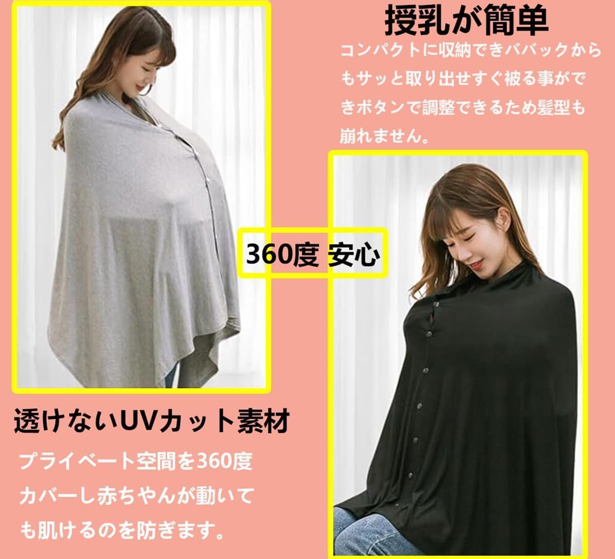 【360度カバーで安心の授乳ケープ】授乳中に赤ちゃんとママのプライバシーを守るために360°カバーが装備されています。