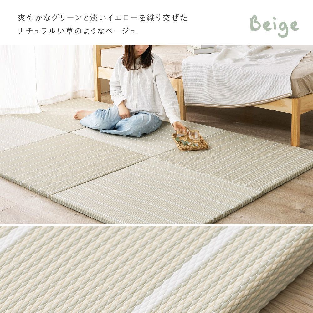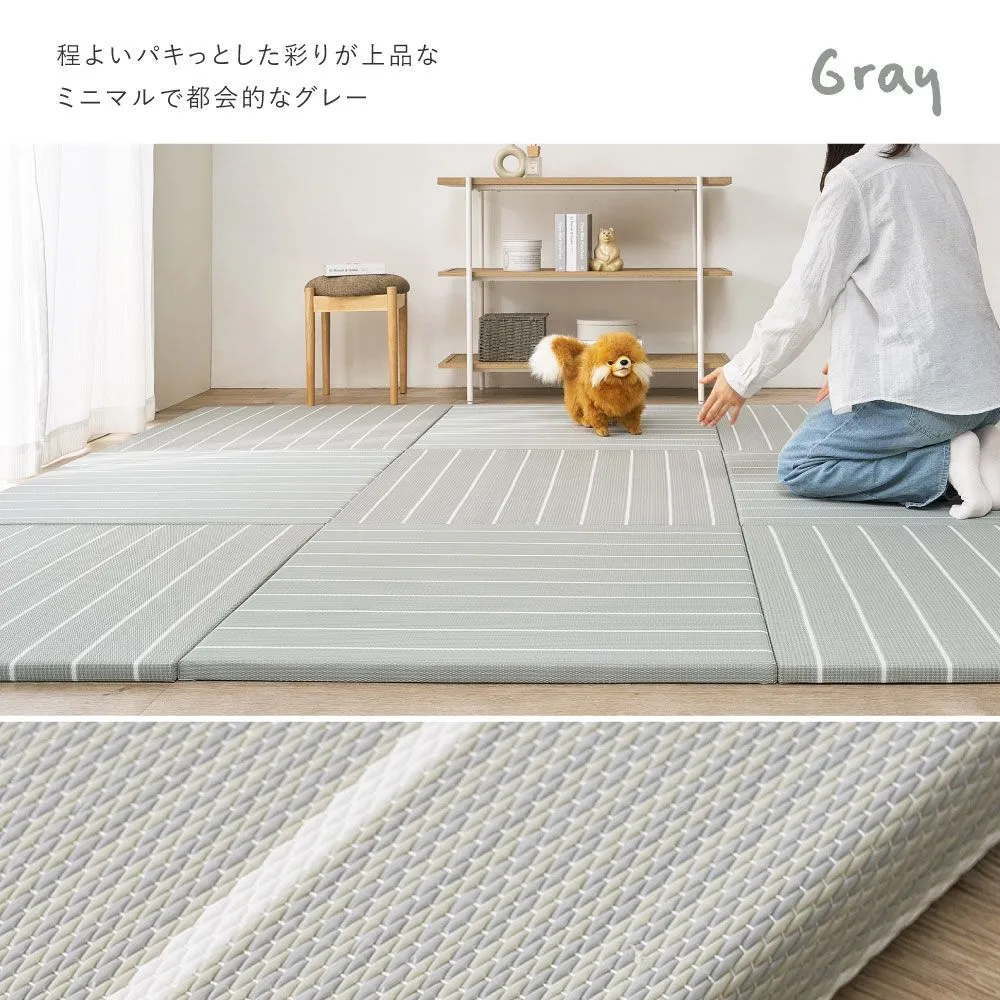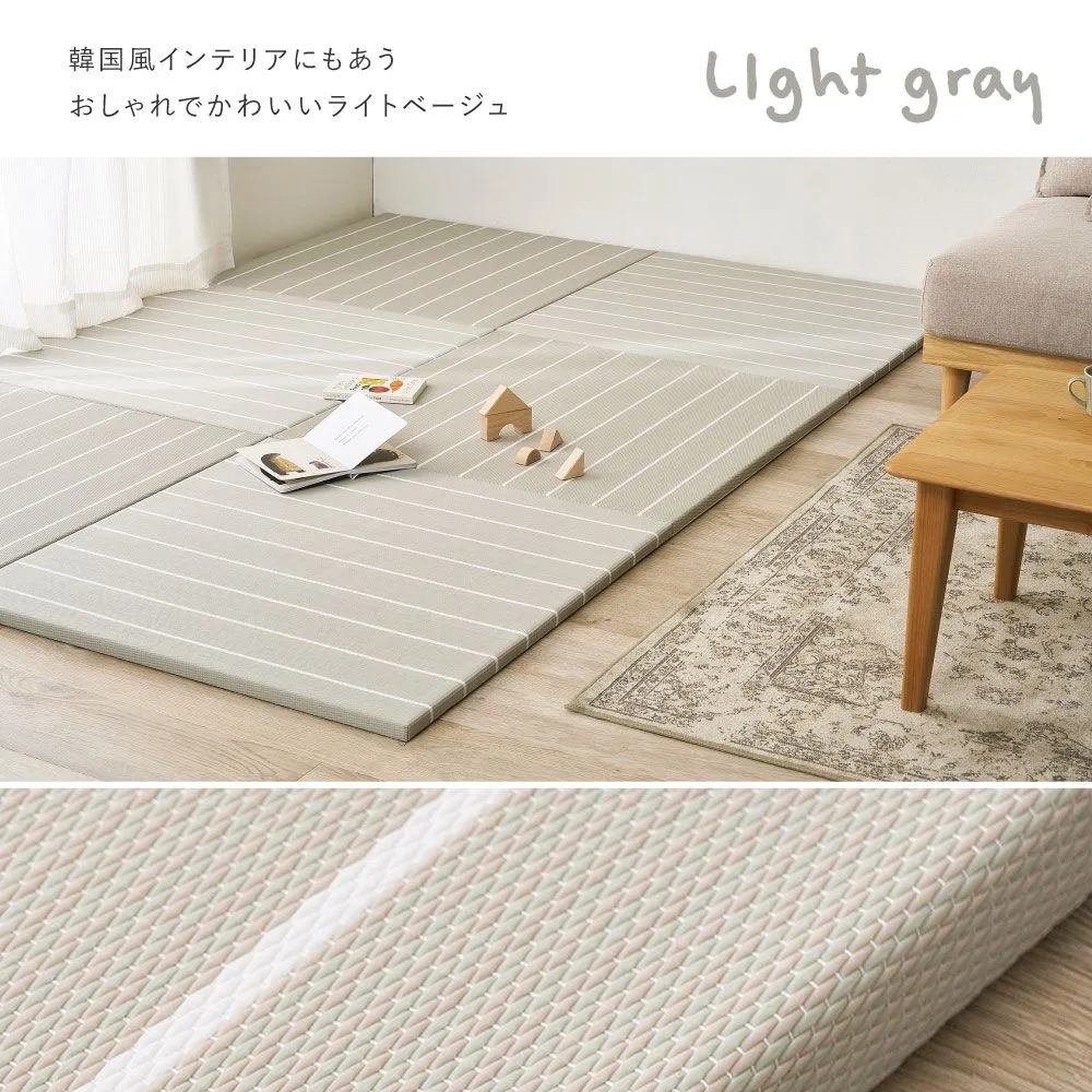 フローリングに並べるだけで、手軽に畳スペースが作れる置き畳。パステル調のい草風素材を使用し、天然い草では表現できない淡いカラーでお部屋をやさしく彩ります。