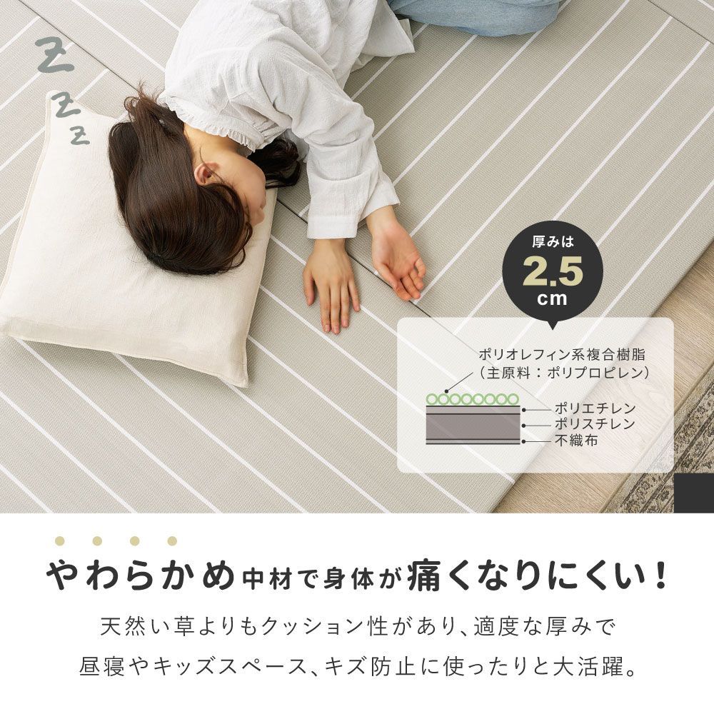 水に強く、汚れてもさっと拭くだけの簡単お手入れ。日焼けや変色に強く、カビも生えにくい素材なので、ペットやお子さまのいるご家庭にもおすすめです。約2.5cmの厚みでクッション性もあり、くつろぎスペースやキッズスペースづくりにも活躍。年中使いやすい、やさしい使い心地の置き畳です。