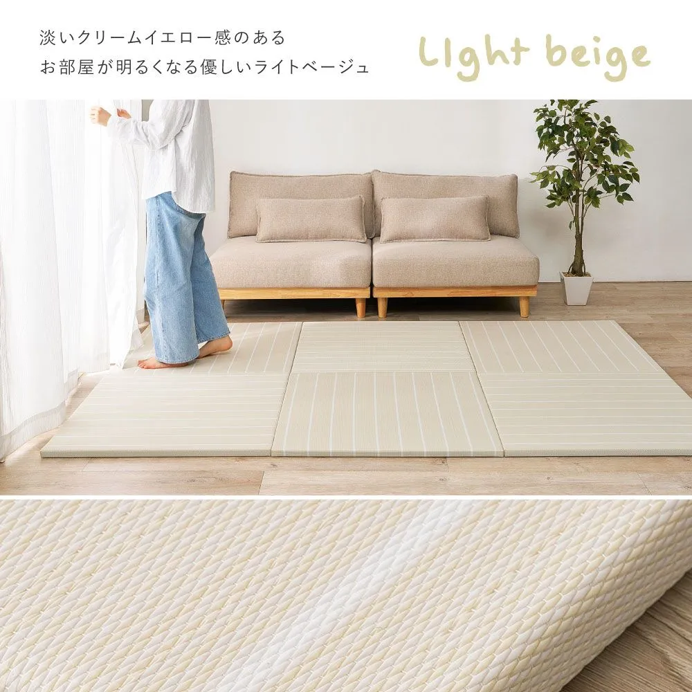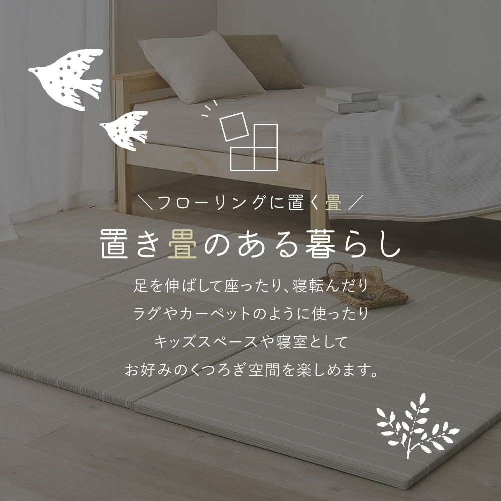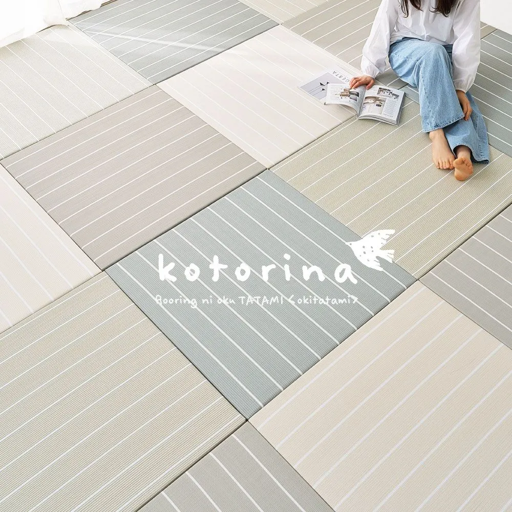 フローリングに並べるだけで、手軽に畳スペースが作れる置き畳。パステル調のい草風素材を使用し、天然い草では表現できない淡いカラーでお部屋をやさしく彩ります。