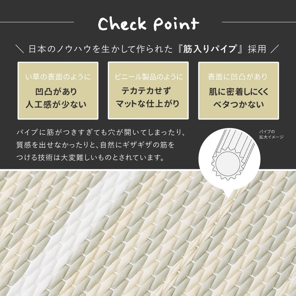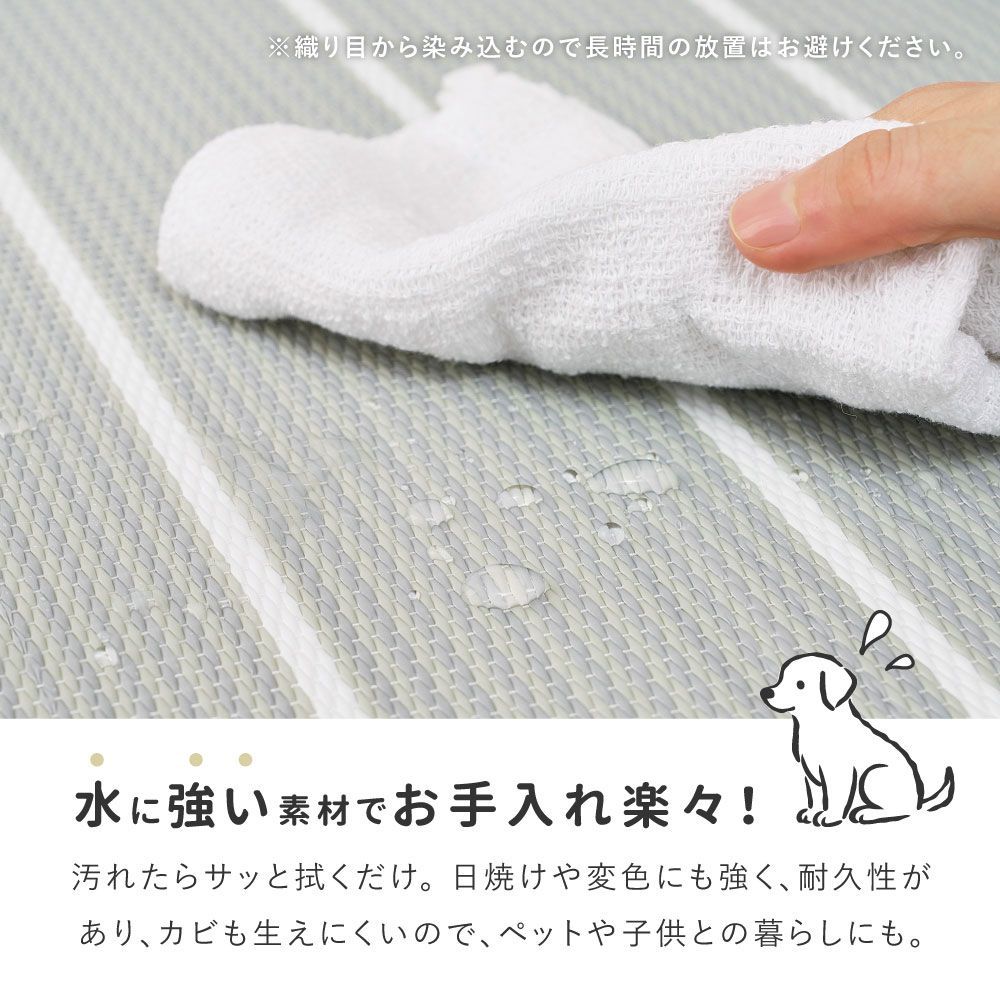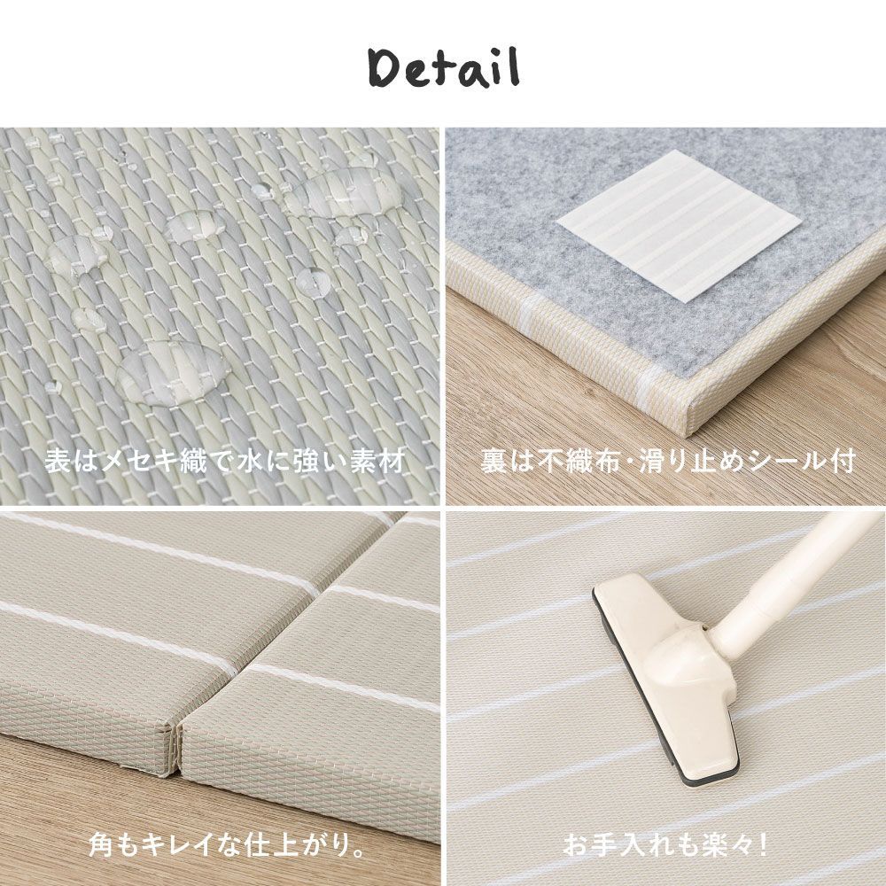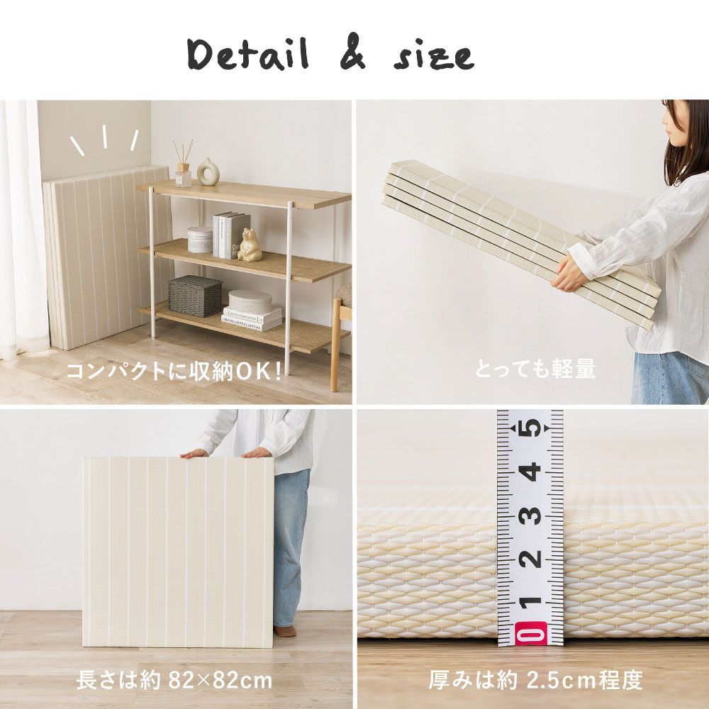 水に強く、汚れてもさっと拭くだけの簡単お手入れ。日焼けや変色に強く、カビも生えにくい素材なので、ペットやお子さまのいるご家庭にもおすすめです。約2.5cmの厚みでクッション性もあり、くつろぎスペースやキッズスペースづくりにも活躍。年中使いやすい、やさしい使い心地の置き畳です。
