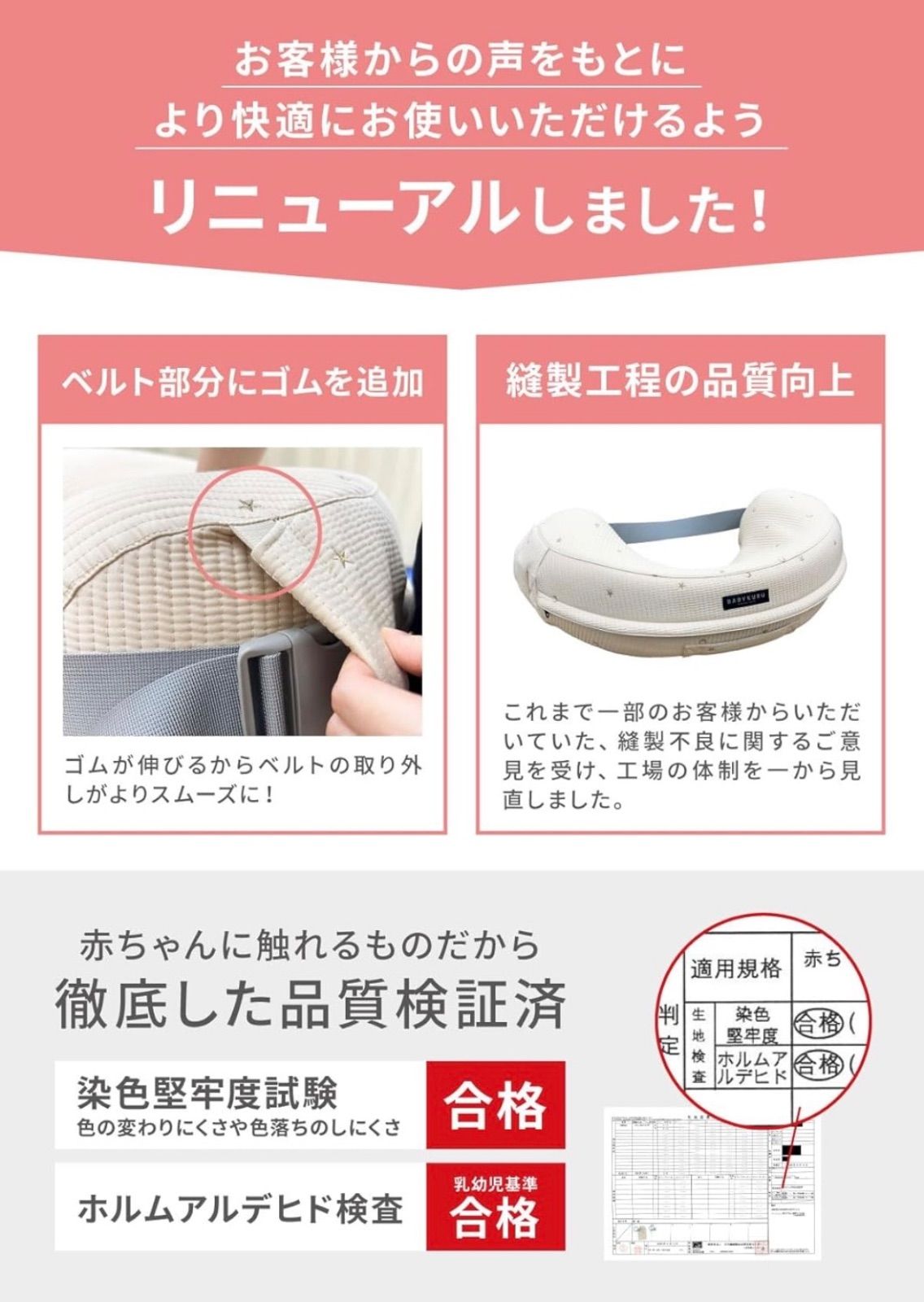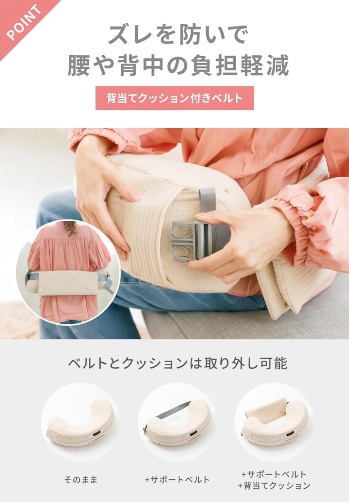 【ズレを防ぐサポートベルト付き】サポートベルトがしっかりとズレを防ぎ、安心して使用できる設計です。さらに、背当てクッションが体の負担を軽減し、快適な使用感を実現しました。親子がくつろぎながら過ごせるよう、細部まで配慮されたデザインです。