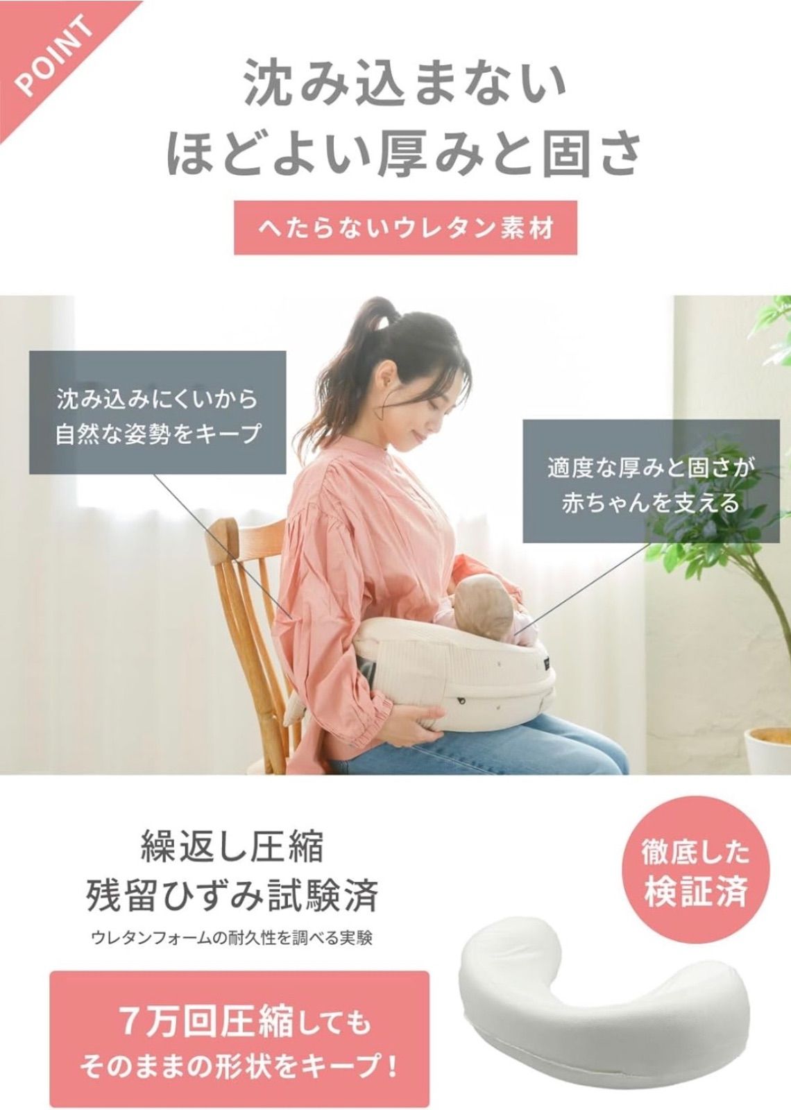 【しっかり支える固さと高さ】充分な厚みと適度な固さで赤ちゃんをしっかり支え、自然な姿勢をサポートします。また、ウレタンファームの耐久性を調べる実験で7万回の圧縮テストをクリアし、形状を保つ信頼の品質で、長く安心してお使いいただけます。