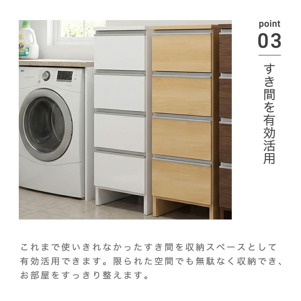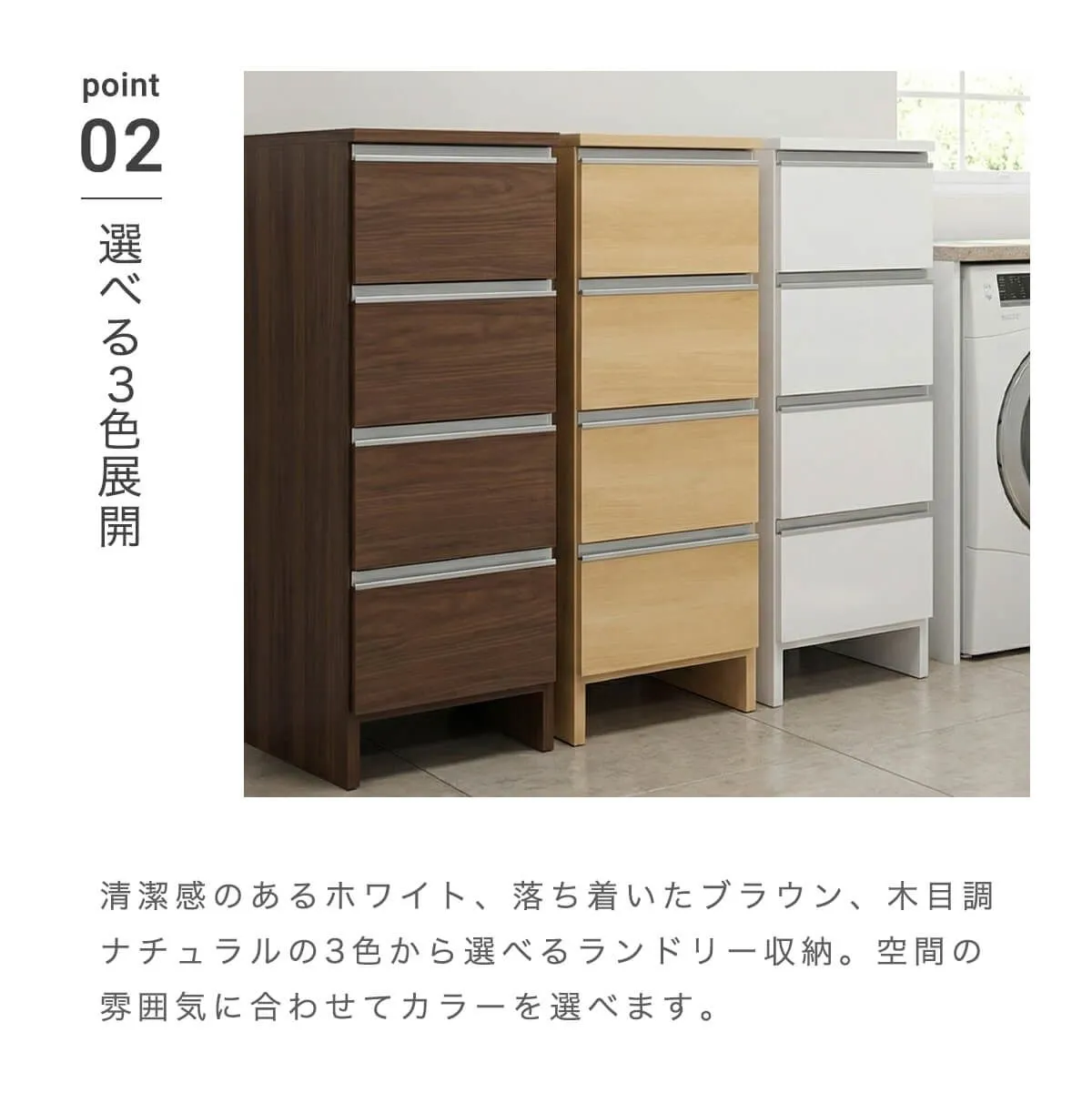 【中型商品】となります。 ※チケット購入の際は、地域がございますので、ご注意ください。 ※※※※※※※※※※※※※※※※※※※※※※※ サイズが選べるロータイプランドリー収納 ────────── 商品名:ポケット35ロータイプ ────────── カ ラ ー:[ ホワイト][ ブラウン][ ナチュラル](全3色) 素 材:WHポリエステル化粧板・NA、BR強化紙 生 産 地:日本 サ イ ズ:348mm(幅)×394mm(奥行)×995mm(高さ) 梱包サイズ:370mm(幅)×420mm(奥行)×1010mm(高さ) ────────── 仕様 ────────── ────────── 備考 ────────── 完成品 引出内寸:幅256×奥行338×高さ135(有効高178)mm 天板耐荷重:約10kg 引出:約5kg 重量:22kg ※商品の詳細につきましては、「商品説明」を確認してください。