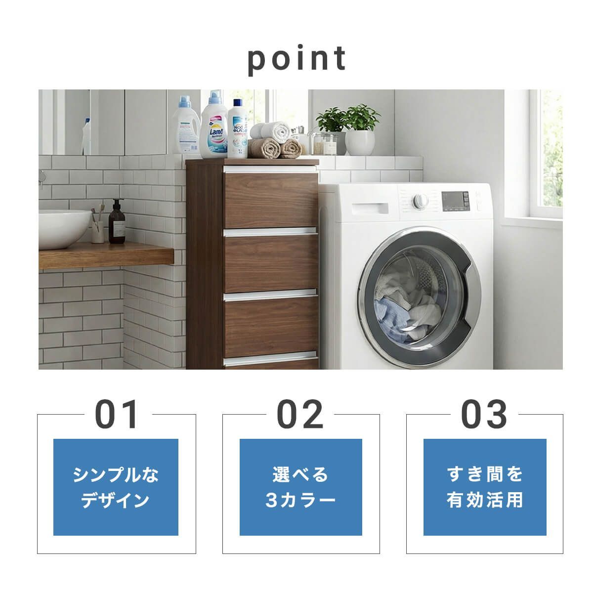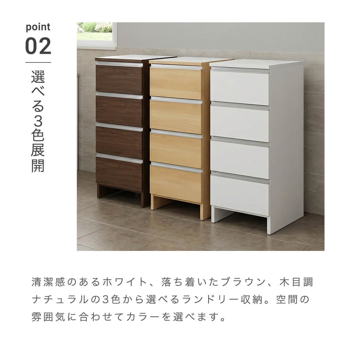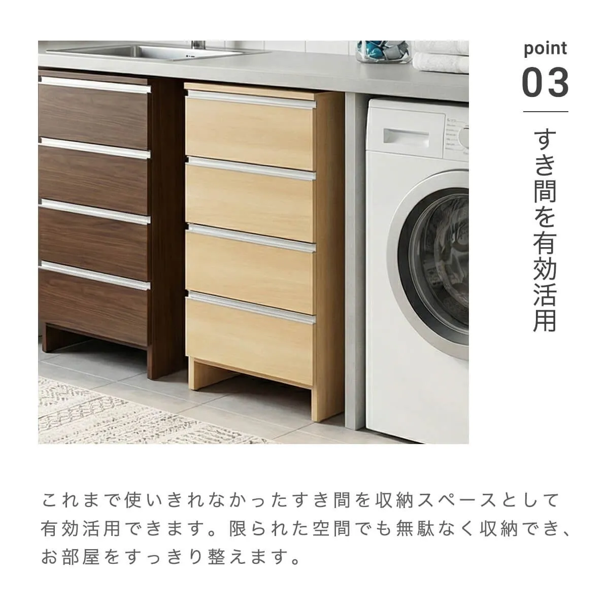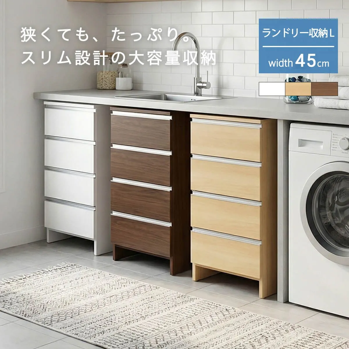 【大型商品】となります。 ※チケット購入の際は、地域がございますので、ご注意ください。 ※※※※※※※※※※※※※※※※※※※※※※※ サイズが選べるロータイプランドリー収納 ────────── 商品名:ポケット45ロータイプ ────────── カ ラ ー:[ ホワイト][ ブラウン][ ナチュラル](全3色) 素 材:WHポリエステル化粧板・NA、BR強化紙 生 産 地:日本 サ イ ズ:448mm(幅)×394mm(奥行)×995mm(高さ) 梱包サイズ:470mm(幅)×420mm(奥行)×1010mm(高さ) ────────── 仕様 ────────── ────────── 備考 ────────── 完成品 引出内寸:幅356×奥行338×高さ135(有効高178)mm 天板耐荷重:約20kg 引出:約5kg 重量:24kg ※商品の詳細につきましては、「商品説明」を確認してください。