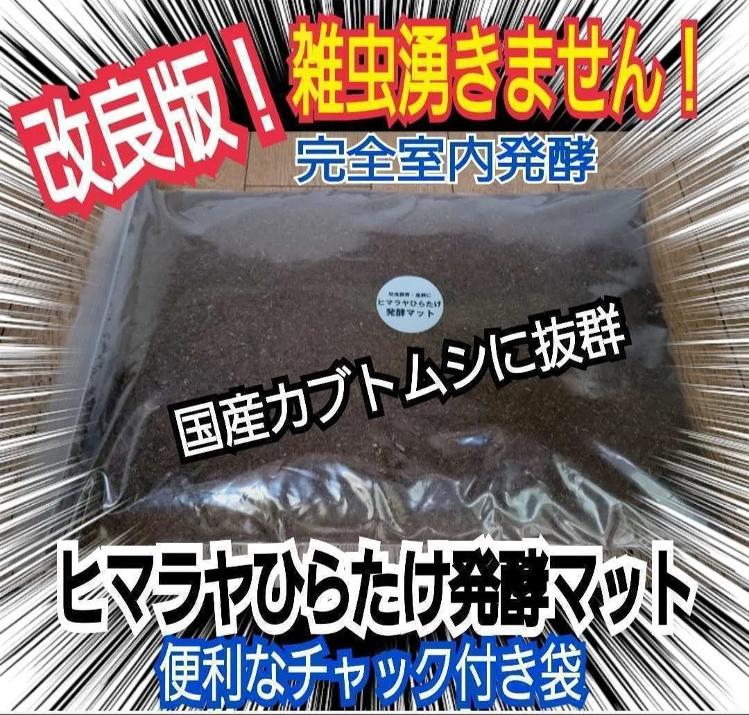 国産カブトムシ幼虫を大きくするために特化した栄養価抜群の『ヒマラヤひらたけ菌床発酵カブトムシマット』の出品です。
