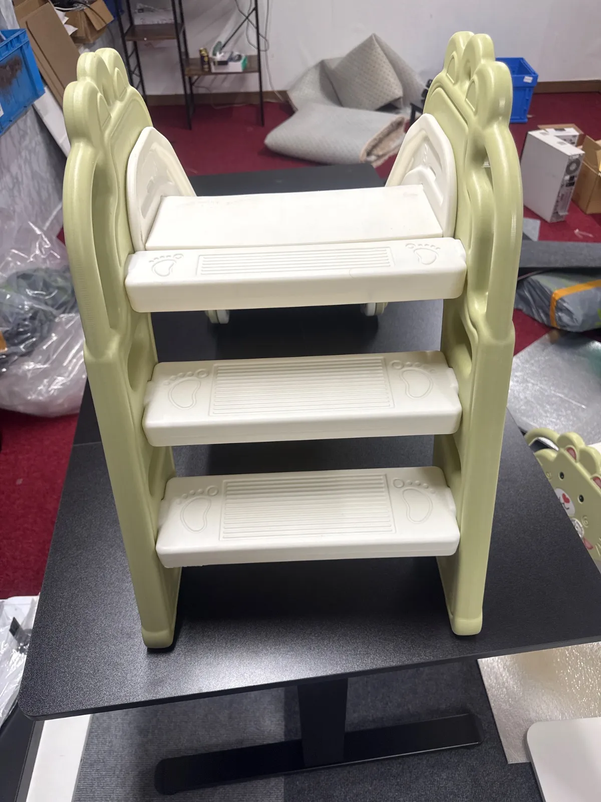 【HDPE素材&安定構造】 滑り台は無臭のHDPE素材を使用しておりまして、変形しにくく耐久性に優れております。角の丸み加工と三角形構造により、安全性と安定性を両立させた室内遊具となっております。