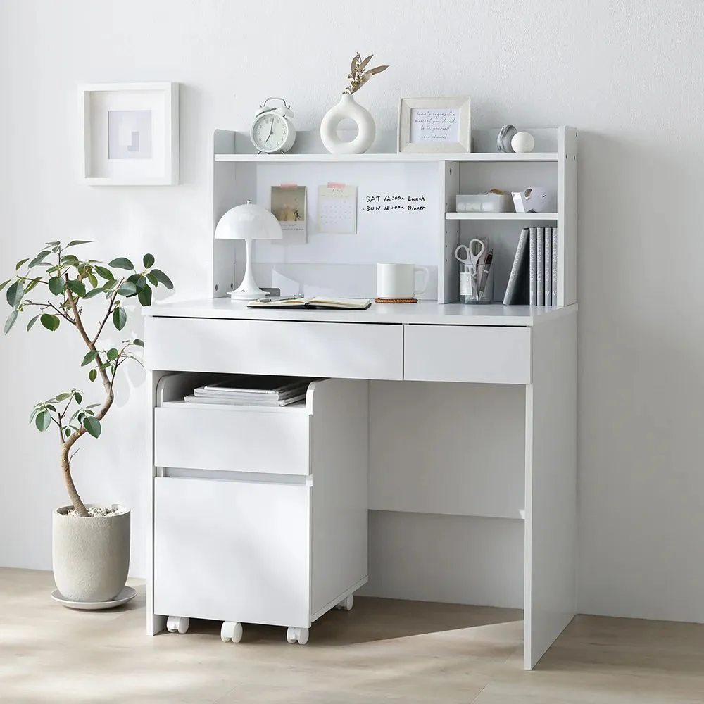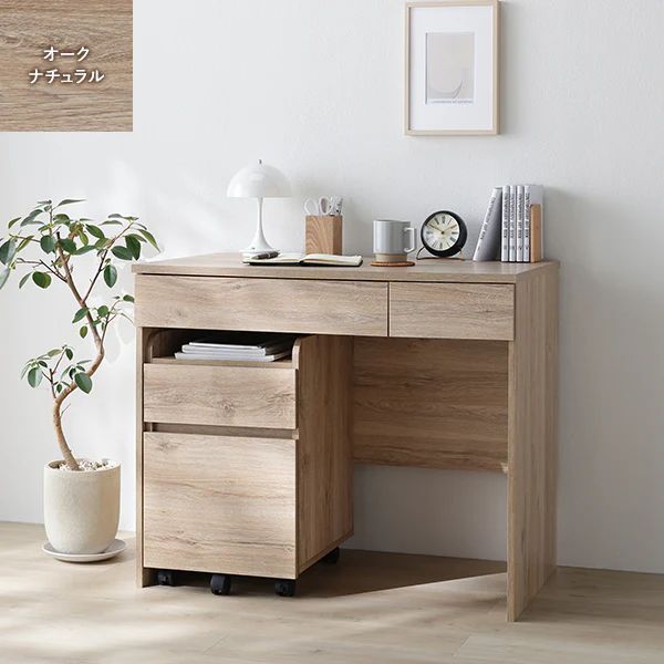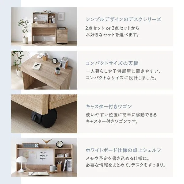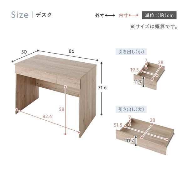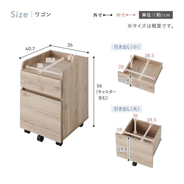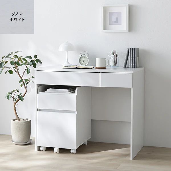 ■COLOR VARIATION ・SONOMA WHITE ソノマホワイト ※木目あり。 ・OAK NATURAL オークナチュラル サイズ ・外寸 デスク:(約)幅86×奥行50×高さ71.6cm ワゴン:(約)幅36×奥行40.7×高さ56cm(キャスター含む) 卓上シェルフ:(約)幅85.1×奥行15×高さ40cm ・引き出し内寸 デスク引き出し〈小〉:(約)幅19.5×奥行28×高さ7cm デスク引き出し〈大〉:(約)幅51.5×奥行28×高さ7cm ワゴン引き出し〈小〉:(約)幅28×奥行28.5×高さ5cm ワゴン引き出し〈大〉:(約)幅28×奥行28.5×高さ18cm ※各サイズは概算です。 素材・その他
