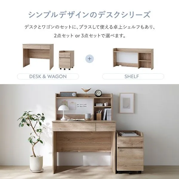 ■シンプルデザインのデスクシリーズ デスクとワゴンのセットに、プラスして使える卓上シェルフもあり、 2点セットor3点セットで選べます。 ・2点セット(デスク+ワゴン) ・3点セット(デスク+ワゴン+卓上シェルフ)