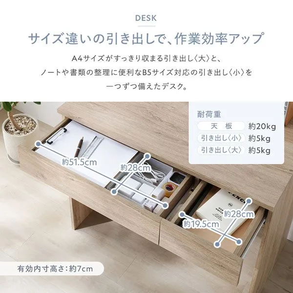 【引き出し内寸】 引き出し〈小〉:約幅19.5×奥行28×7cm 引き出し〈大〉:約幅51.5×奥行28×7cm