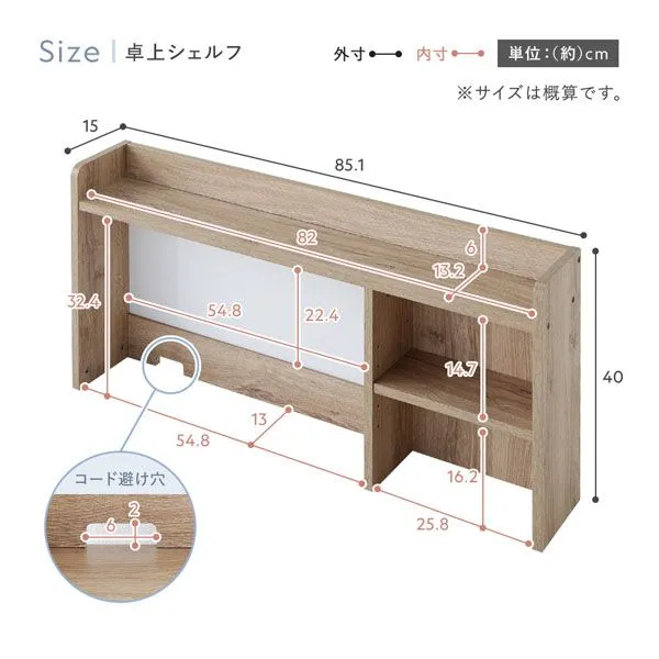 【耐荷重】 可動棚:約5kg 上棚:約2kg ・コード避け穴 デスクライトなどの配線もしやすいコードを避ける穴付き。 ・ちょっとした小物が置ける上棚スペース 卓上シェルフの上段は棚になっているのでお気に入りの小物などを飾っておけます。