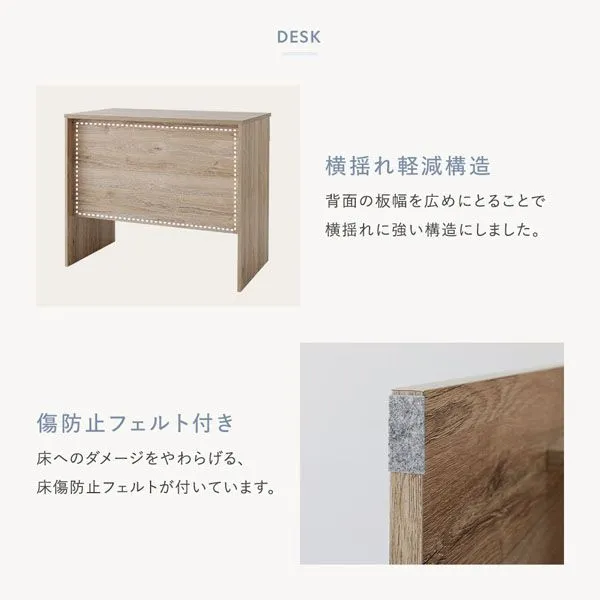【耐荷重】 天板:約20kg 引き出し〈小〉:約5kg 引き出し〈大〉:約5kg ・横揺れ軽減構造 背面の板幅を広めにとることで横揺れに強い構造にしました。 ・傷防止フェルト付き 床へのダメージをやわらげる、床傷防止フェルトが付いています。