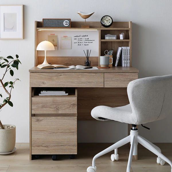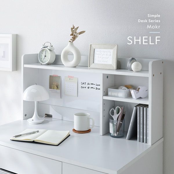 ■SHELF ・書くを楽しむホワイトボード仕様 卓上シェルフはメモや予定を書き込めるホワイトボード仕様。 必要な情報をまとめて、デスク周りをすっきり整えます。 ・棚板は便利な可動仕様 収納物に合わせて棚の高さを調整できる約3cmピッチの可動棚。 ファイルや小物も無駄なく収まり、使い方の幅が広がります。