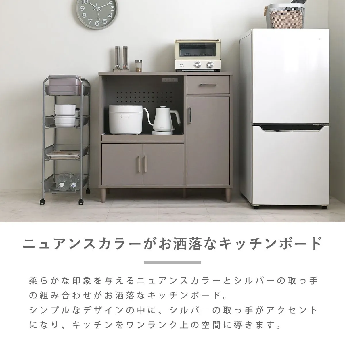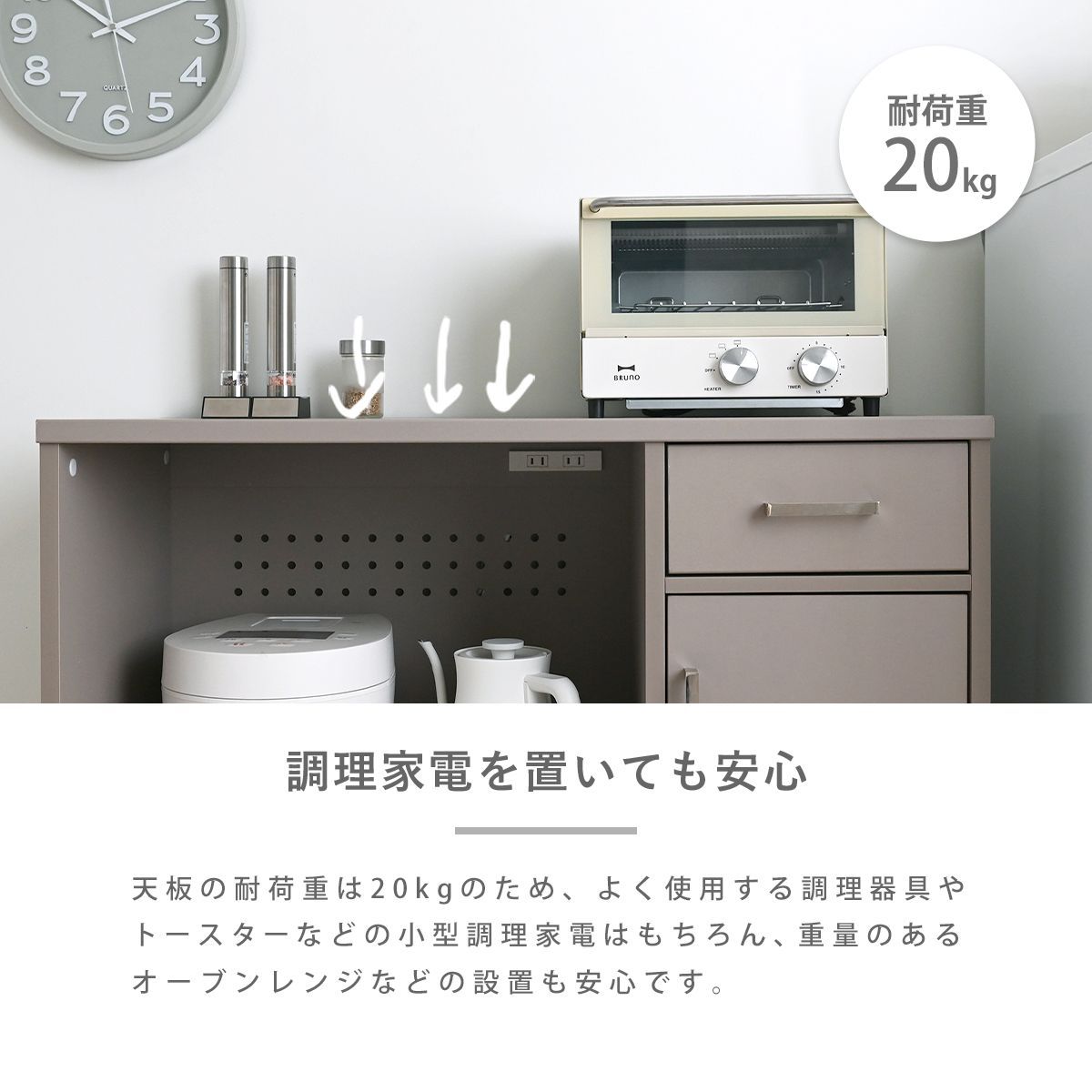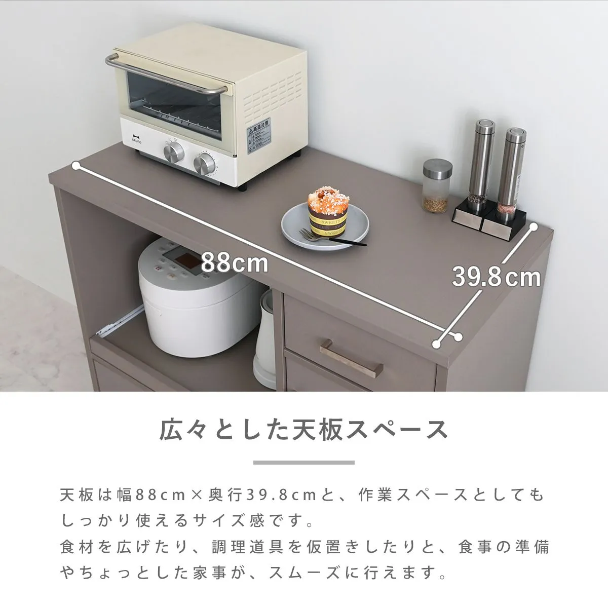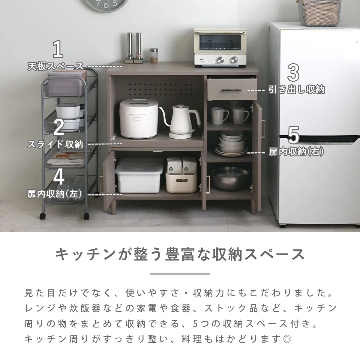 見た目だけでなく、使いやすさ・収納力にもこだわりました。レンジや炊飯器などの家電や食器、ストック品など、キッチン回りの物をまとめて収納できる、5つの収納スペース付き。キッチン回りがすっきり整い、料理もはかどります。