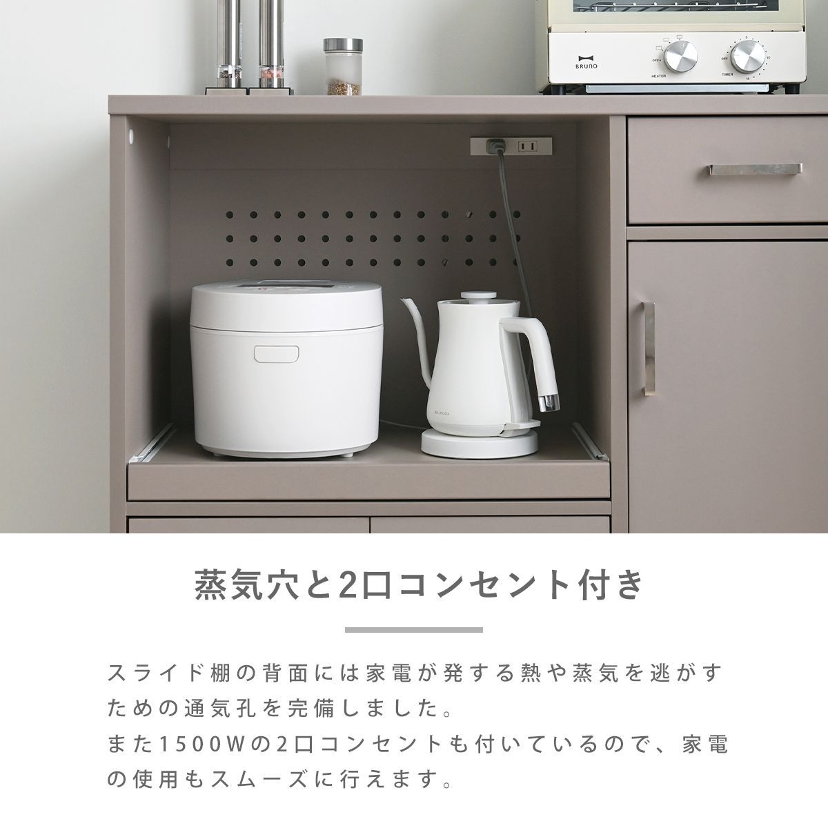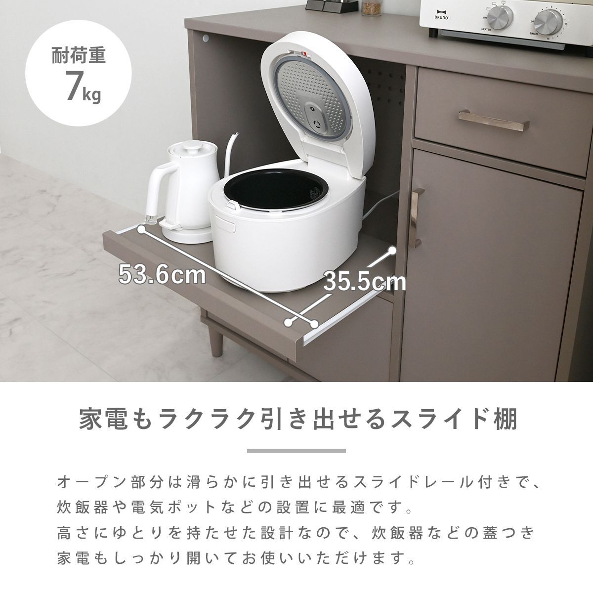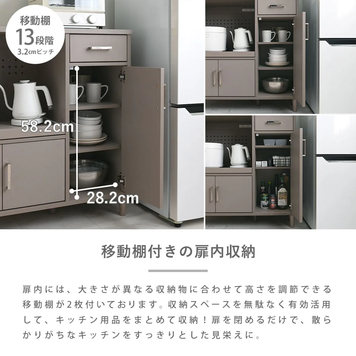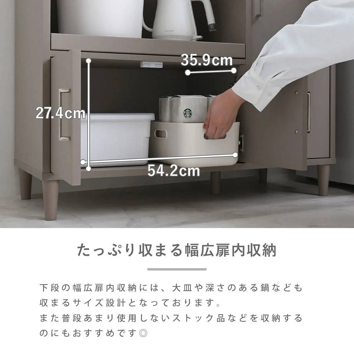 見た目だけでなく、使いやすさ・収納力にもこだわりました。レンジや炊飯器などの家電や食器、ストック品など、キッチン回りの物をまとめて収納できる、5つの収納スペース付き。キッチン回りがすっきり整い、料理もはかどります。