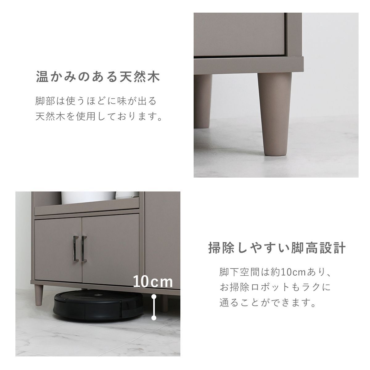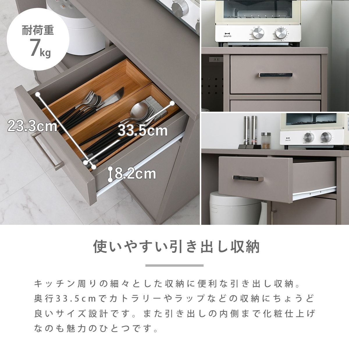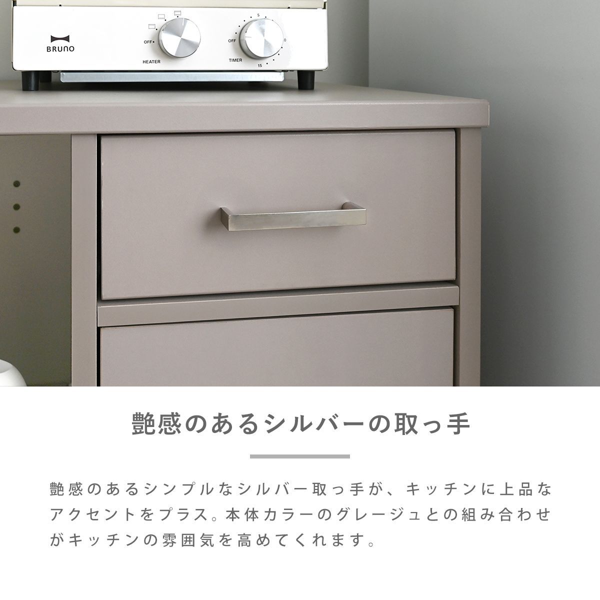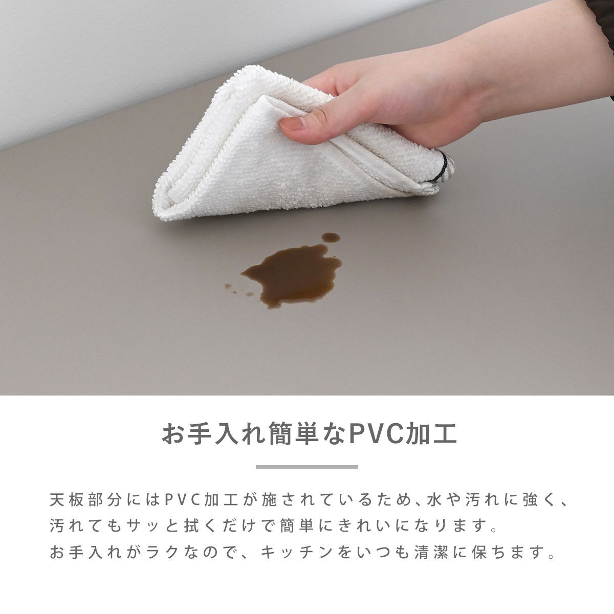 見た目だけでなく、使いやすさ・収納力にもこだわりました。レンジや炊飯器などの家電や食器、ストック品など、キッチン回りの物をまとめて収納できる、5つの収納スペース付き。キッチン回りがすっきり整い、料理もはかどります。