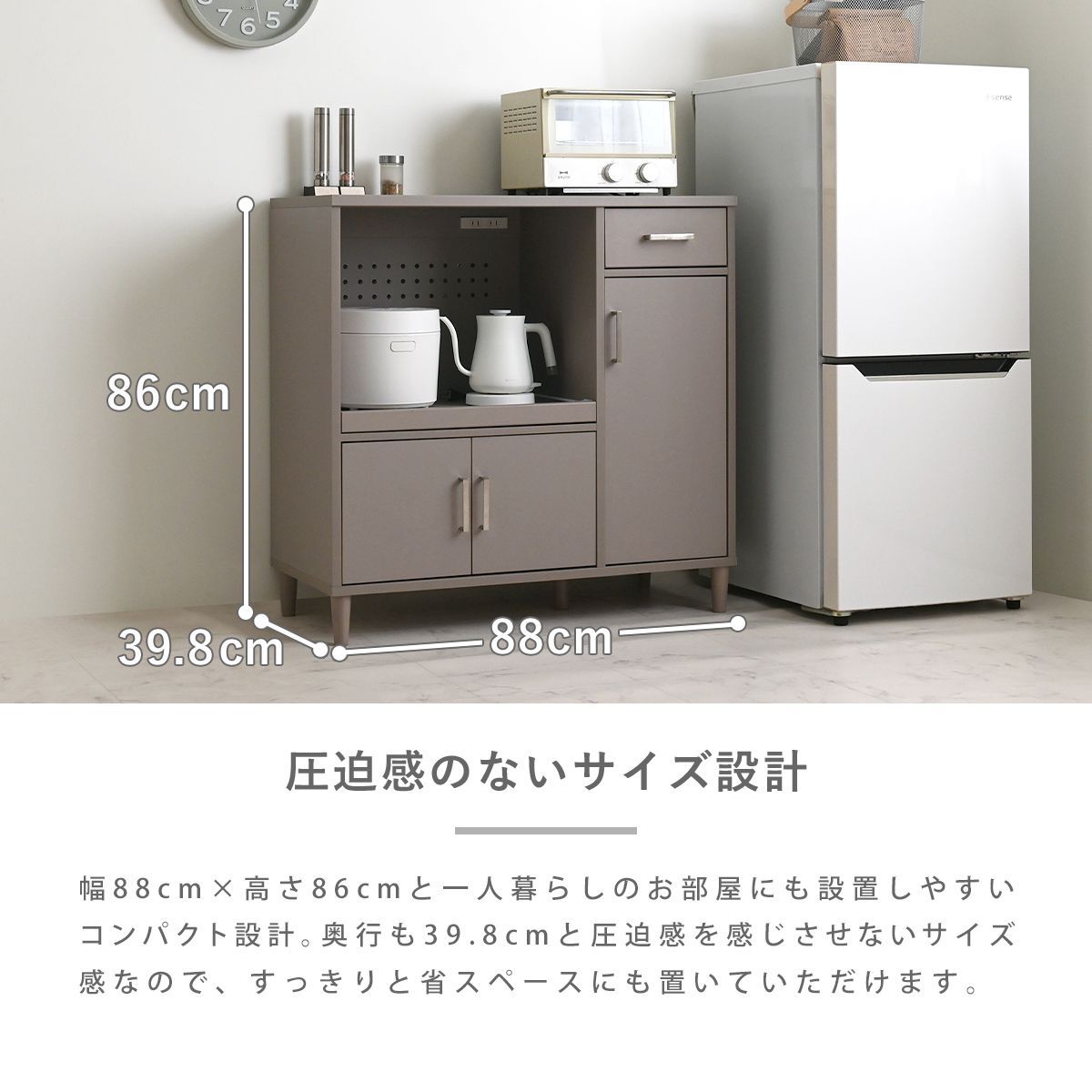幅88cm×高さ86cmと一人暮らしのお部屋にも設置しやすいコンパクト設計。奥行も39.8cmと圧迫感を感じさせないサイズ感なので、自由度高く設置可能。
