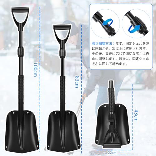 【折りたたみ式・組立不要】折りたたみ式で伸縮可能なデザインにより、複雑な組み立てが不要です。シャベルを展開し、ハンドルを伸ばすだけで、すぐに使用できます。長さ調整できる雪かきは、83cmから100cmまで調節することができます。