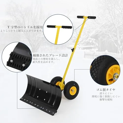 【高い耐磨耗性】ゴム製のタイヤは衝撃を緩和することができ、滑りにくくて摩耗しにくい特徴があります。また、雪かきの底部にあるショベル板は、地面との摩擦を高め、雪かきの効率を向上させます。
