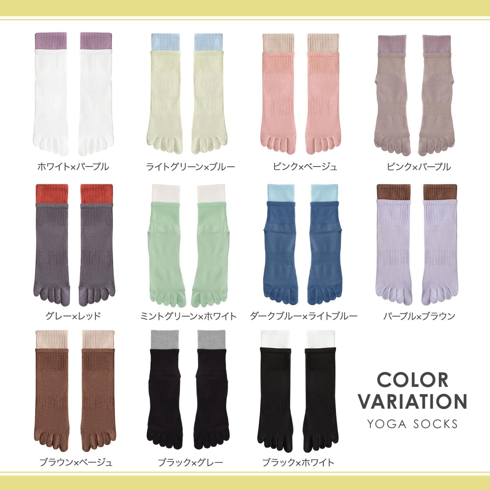 【カラフルな2色使い】お手持ちのレギンスに合わせて、コーデを楽しめるオシャレなヨガソックス。ウェアを選ぶように、専用ソックスもお気に入りのものを選ぶと気分も上がりますよね!好きな組み合わせカラーが見つかる、全7色からお選びいただけます。洗い替え用に複数購入、色違い購入もおすすめです。