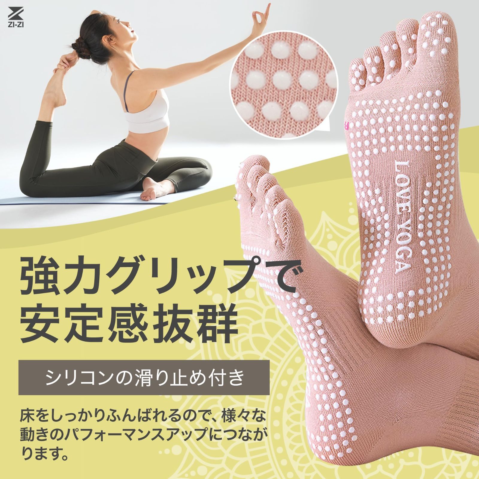 【新商品】通気性×抗菌・防臭!オシャレなヨガソックス ダブルカーフでずれ落ちしにくくツートンカラーでおしゃれ室内(フローリングなど)でのヨガ中、足裏に汗をかくととても滑りやすく危険です。ZI-ZIの5本指滑り止めヨガソックスは、強力な滑り止めにより転倒などの事故を防ぎ、足元を安定させることでヨガに集中できる便利なアイテム。汗を吸収し蒸れにくいので、気になる臭い対策にもバッチリ・ライクラ(LYCRA)素材使用で伸縮性抜群 ◎2色使いがオシャレなデザインなので、お気に入りのウェアとのコーディネートをお楽しみください。※抗菌防臭加工 最後までご確認頂き誠にありがとうございました。 上記をご確認頂き、ご購入いただけましたら幸いです。 何かご不明な点がございましたらお気軽にメッセージからお問い合わせ下さい。
