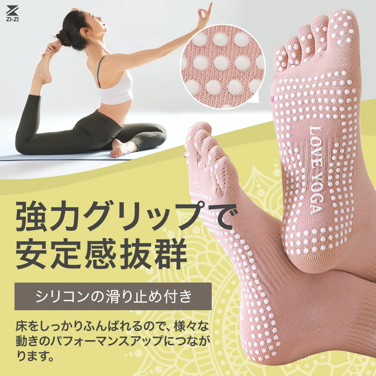 【足裏の強力グリップ】指先までカバーした足裏全面にあるシリコンの滑り止めは、安定性があり床をしっかりふんばることができるため、様々な動きのパフォーマンスアップにつながります。ヨガ・ピラティス・フィットネスなどの動きを妨げず、より快適にお楽しみいただけます。
