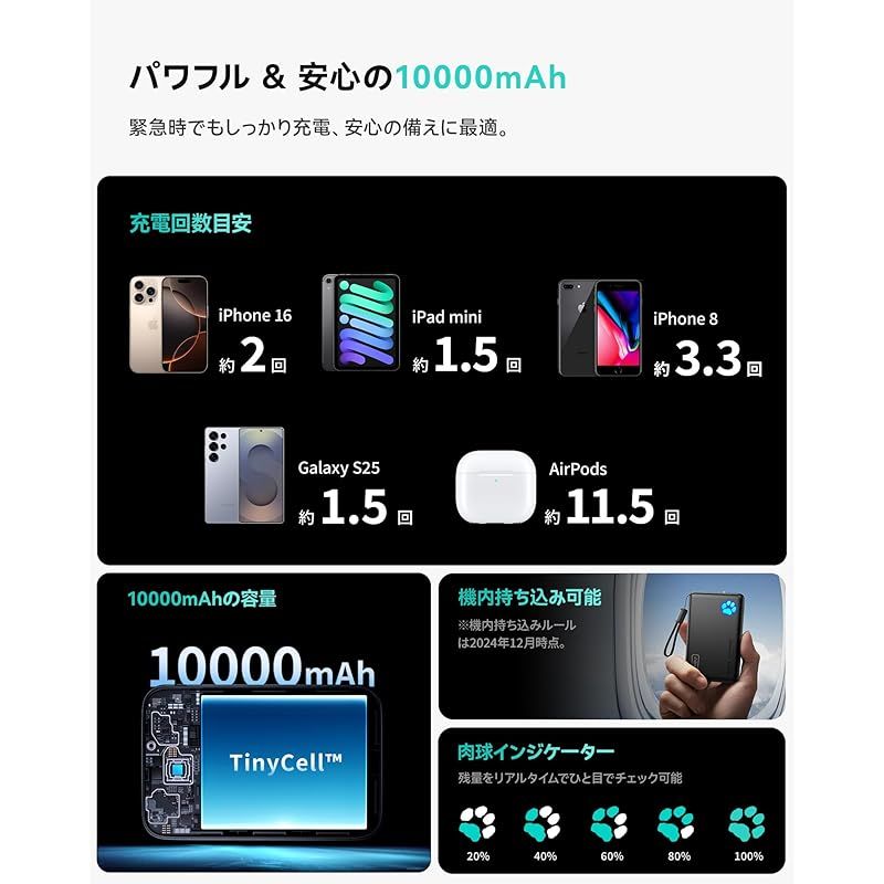 【パッケージ内容】INIU 10,000mAhモバイルバッテリー×1、ストラップ式 USB-C ケーブル (USB-C to C)×1、ユーザーマニュアル(日本語付き)×1、カスタマーサポート。