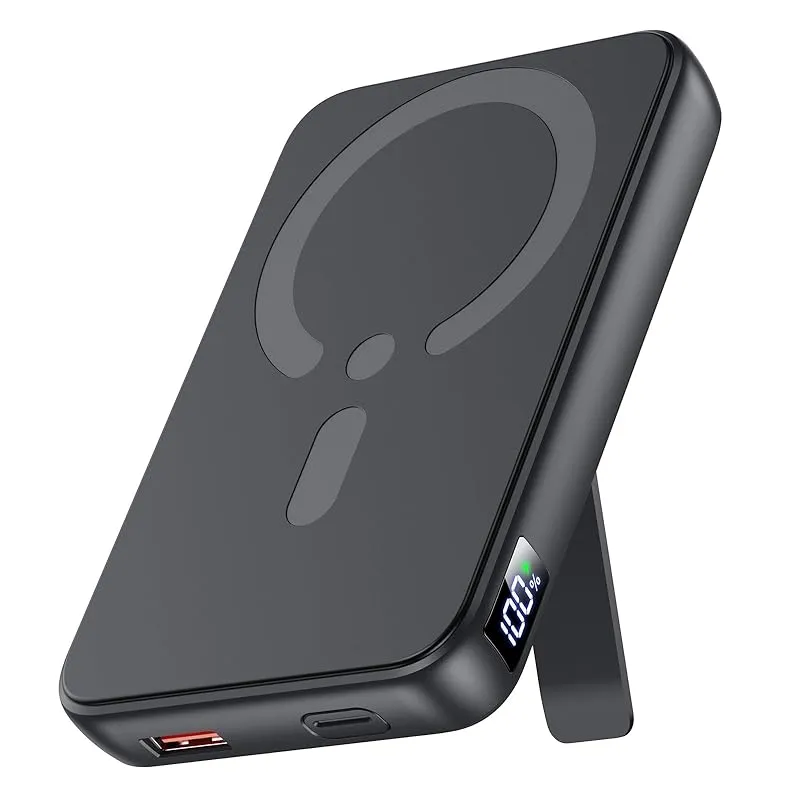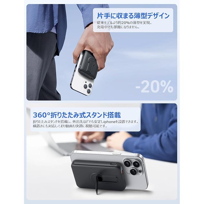 モバイルバッテリー Magsafe対応 【12000mAh大容量・360°回転スタンド付き・3台同時充電可能】 軽量 大容量 小型 最大22.5W急速充電 ワイヤレス充電器 マグセーフ マグネット式 USB-A出力ポート/Type-C出入力ポート LCD残 1
