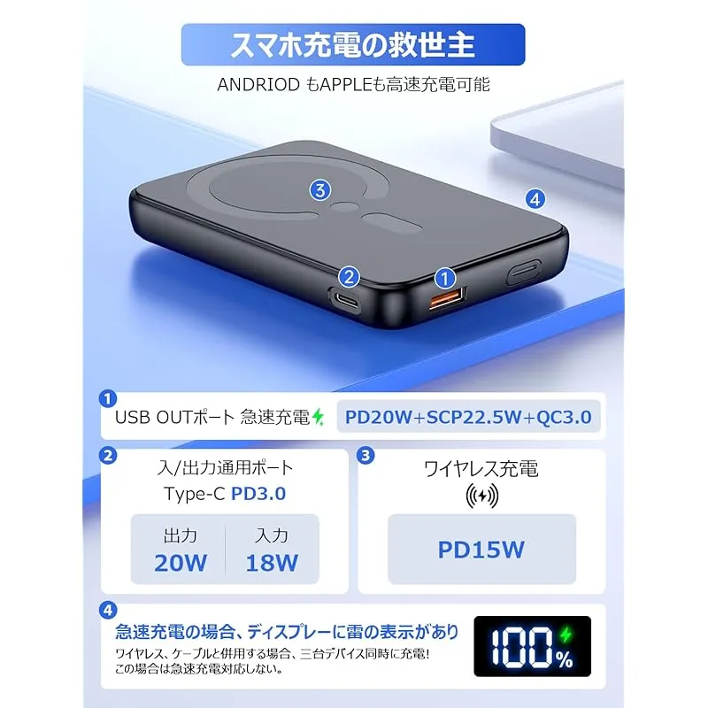 【最大22.5W急速充電&3台同時充電可能】アメリカのQualcomm通信会社のPower Delivery 、QuickCharge3.0等の充電規格に準拠し、USB-A出力ポート、Type-C出入力ポート、ワイヤレス充電を含む3種類の出力方式があって、最大22.5W出力で充電が可能、充電効率を95%に向上し、限られた時間の中で最大の充電効率を発揮し、従来製品に比べて約4倍早くスマホを充電できるスピードを実現!また、ワイヤレス急速充電だけでなく、Type-CとUSB-Aポートも設置されており、iPhone/iPad/Android 各種対応、3つのモバイルデバイスを同時に充電できるので、友達や、家族へシェアができてとても便利です。「ご注意:同時充電する際には急速充電モードに入らないので、予めご了承ください。」