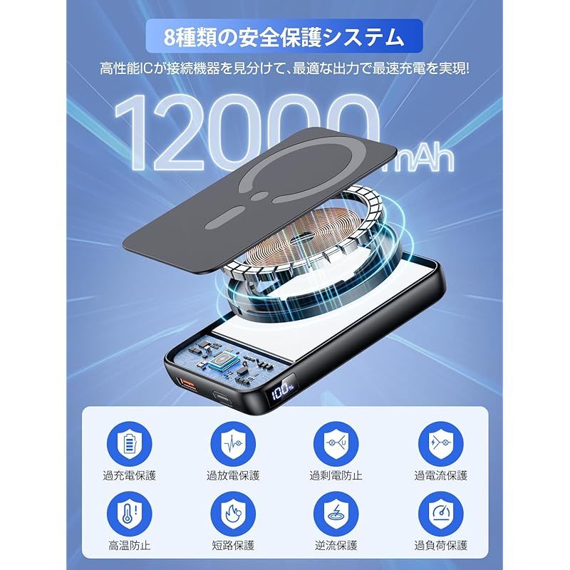 【12000mAh大容量&妥協しないPSE安全認証】小型化と高出力化の両方を兼ね備えた次世代12000mAh モバイルバッテリーが新登場!12000mAh大容量モバイルバッテリーは、外出では家族とシェアしたり、出張中に社用携帯と個人端末を同時に充電できるなど満足感のある容量です。またコンパクトでスマホと重ねて持ってもカバンの中に入れても負担にならないです。iPhone17/16/15/14シリーズへ複数回充電が可能です。それに、長期間安心してお使いいただけるように、本製品はUN38.3に準拠した発火しにくく、より膨れにくい電池の構造技術を採用、過充電・過放電・過電圧・過電流防止機能および短絡保護機能と温度検知機能の6つの保護機能など安心の回路設計を備えました。