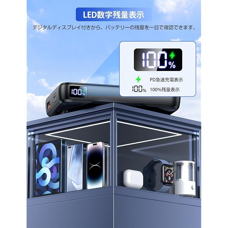 【一目瞭然のLCDディスプレイ残量表示&高級感溢れるデザイン】市販中のあいまいな点滅ランプとは違い、??1%刻みで残量を表示する新常識なLCD(Liquid Crystal Display)ディスプレイを搭載、視認性に優れており、バッテリー残量と急速充電状態をひと目で確認でき、充電のタイミングがより掴みやすく、充電切れの心配もありません。モバイルバッテリーの本体が高級感溢れる艶消しの基調とし、汚れにくく傷のつきにくいスタイリッシュなメッシュ加工等、細部までこだわり、上質さを演出します。持ち運びにもコンパクトなサイズは重さから解放され、ポーチやカバンに入れて持ち歩いても邪魔にならず、旅行や充電環境のないアウトドアシーンに持ち出すことも楽しくなります。