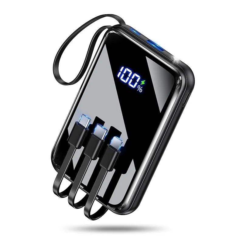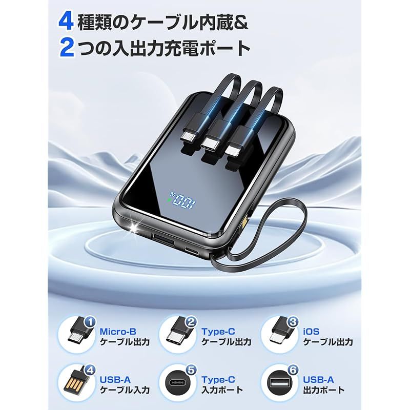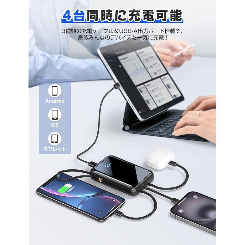 【4本のケーブル×2ポートで「いつでもどこでも」充電可能】?この大容量 モバイルバッテリーは、あらゆる充電シーンをカバーする「究極の充電ツール」として登場しました。本体には4本の充電ケーブルが付属:Type-C(出力)、Lightning(出力)、Micro-B(出力)、USB -A(入力)がそろい、スマートフォンやタブレット、旧型機器まで対応可能です。さらに、本体には2つの充電ポートも搭載:Type-C(入力)とUSB-A(出力)で、必要に応じて柔軟に充電方法を選べます。??最大の特徴は「4台同時充電」機能です。付属ケーブルと本体ポートを組み合わせることで、スマートフォン、タブレット、イヤホンなど4台の機器を一斉に充電でき、混雑したカフェや移動中でも「順番待ち」が不要です。充電方法も2種類:必要に応じて付属ケーブルを直接差し込むか、本体ポートを使うか、シーンに合わせて選べるため、従来のモバイルバッテリーよりも格段に利便性が高いです。