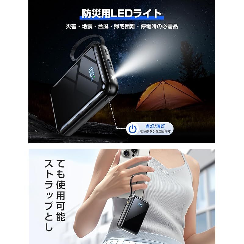 【LED照明×充電両用で防災・日常を「安心1台」】?弊社のモバイルバッテリーが「1台で2つの課題」を一気に解決します!本体に搭載された明るいLEDライトは、停電時の室内照明や防災避難時の足元照らしに最適。明かりがない夜道やガスコンロの点火作業でも、すぐに手元を照らしてくれる「ライト機能」が、緊急時の不安を大幅に軽減します。??しかも、「充電」と「照明」を両立!通常はスマートフォンやタブレットの充電に、緊急時はLEDライトを使って明かりを確保??2つの機能を必要に応じて切り替えられるため、防災グッズとしても、日常の外出用としても重宝します。操作も超シンプル:電源ボタンを2回軽く押すだけでライトが点灯、もう一度2回押すと消灯。本体重量はたった230g。鞄の中で圧迫感を感じることなく、ポケットに入れるほどコンパクトです。