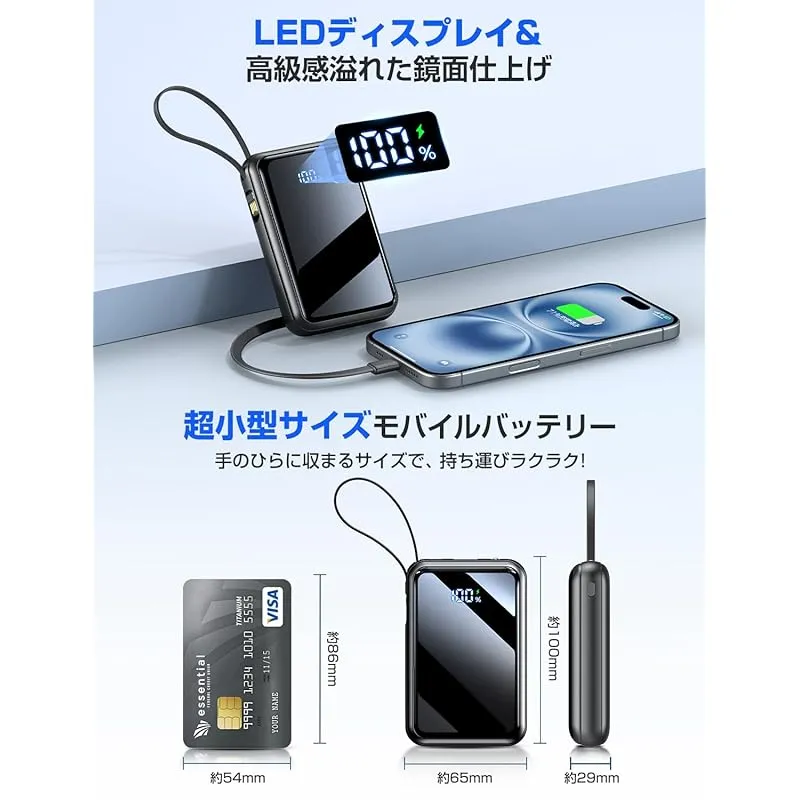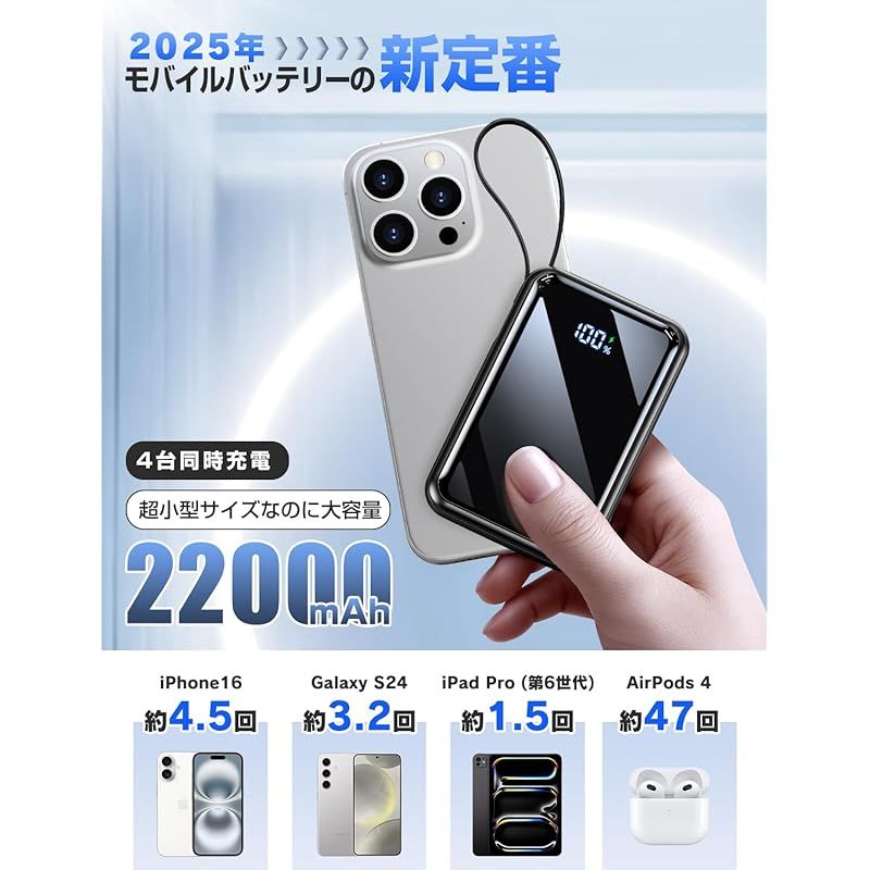 【大容量×超小型!22000mAh ポケットサイズパワーバンク】?外出先での充電不安を一掃する、圧倒的な「容量」と「コンパクトさ」を兼ね備えたモバイルバッテリーが登場しました。22000mAhという超大容量を搭載しながら、手のひらに収まるコンパクトさを実現したこのモバイルバッテリーは、iphone 16を約4.5回充電可能で、タブレットやノートPCまで複数機器を連続充電できるため、長時間の外出や移動中でも「充電切れ」を心配する必要がありません。??さらに驚くのはサイズです??本体サイズはわずか101×66×29mm。手のひらにのせても重くなく、ポケットや小さなバッグに簡単に収納できるため、持ち運びに負担はありません。従来の大容量 モバイルバッテリーが抱える「大きさ」「重さ」の課題を解決し、日常移動から長時間出張まで、あらゆるシーンで「安心」を提供します。