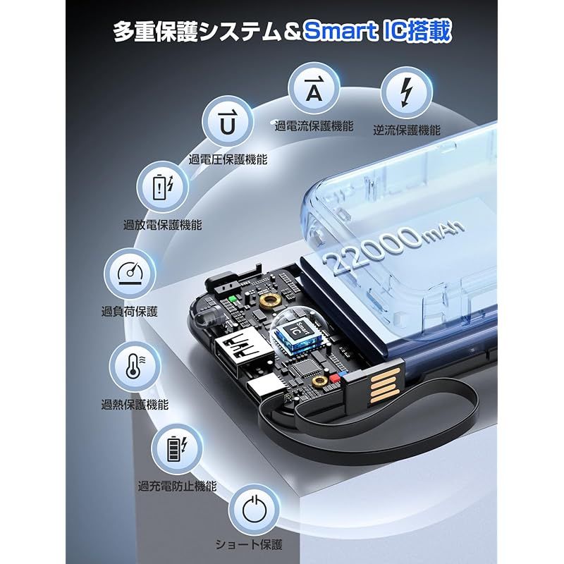 【PSE認証×22000mAhで飛行機も「安心持ち込み」可能】?まず、日本の電気用品安全法(PSE)に準拠した認証を取得しており、材料選定から回路設計まで、厳格な安全基準をクリア。「発熱」「漏電」といったトラブルを未然に防ぐ「本当に安全なパワーバンク」として、家庭でも旅先でも信頼できます。??さらに、「過充電保護」「過放電保護」「短絡保護」「逆流保護」「過電?保護」「過負荷保護」「過熱保護」「ショ一卜保護」「過電流保護机」の8大安全機能を搭載。スマートフォンを充電中に誤って放置しても、バッテリーが過剰に充電されることはありません。「安全」を2重、3重に守る仕組みが、このモバイルバッテリーの最大の強みです。??22000mAh(81.4Wh)の大容量バッテリーは、航空法で定める「100Wh未満で持ち込み可」の基準をクリア。海外旅行や国内線でも、手荷物としてそのまま持ち込めるため、移動中の充電不安を一掃します。