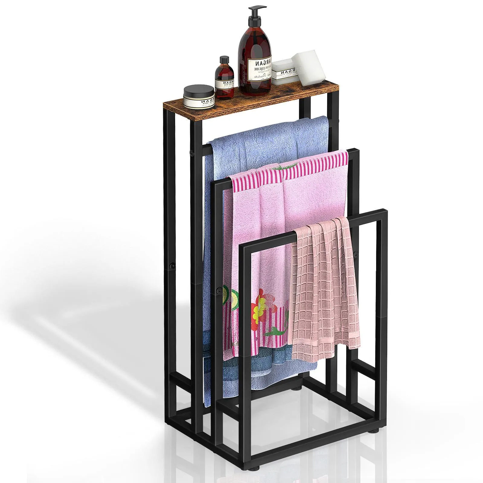 【3連の収納デザイン】ハンガーラックには合計3連の収納があり、日用品を置ける天板も付いています、より多くのバスタオル、タオル、その他の衣類を収納できます。収納機能は強力で、スペースを効果的に節約できるため、小さく置くことができます、バスルームや洗面所などの場所に最適です