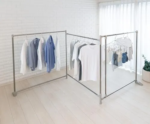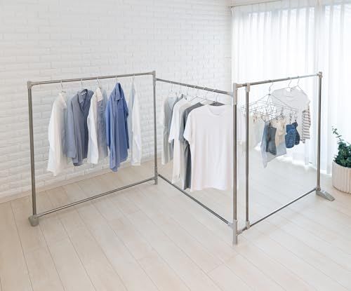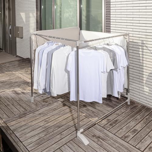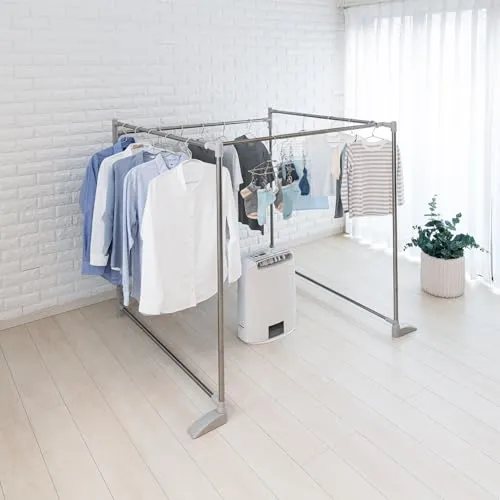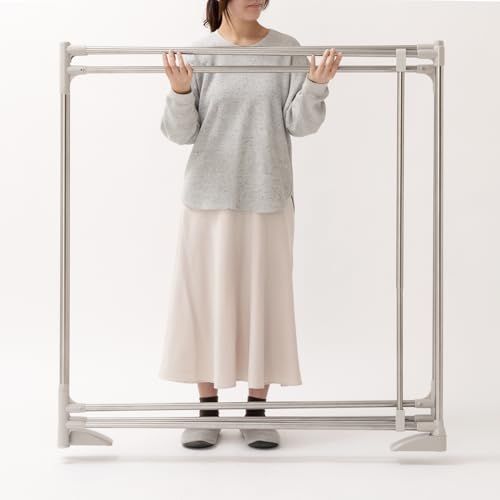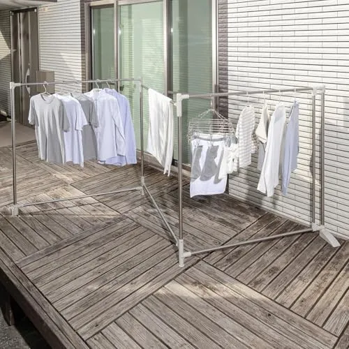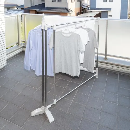 おりたたみ式ふとんほし、専用伸縮竿付きで、ふとんや洗濯物がたくさん干せます。形状はスペ-スに合わせてZ型・サイコロ型・三角形状に変えられます。倒れ防止の脚部。外観規制のベランダでも外から見えにくく干せます。収納は幅10cmとスリムになります。