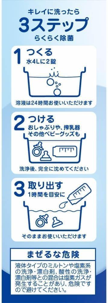 ●溶液から取り出した哺乳びんは、すぐに調乳可能! 煮沸消毒のようにやけどの心配もありません。また、すすがなくても調乳したミルクと反応して身体に無害な成分に分解します。 [成分] (1錠(1.0g)中) ジクロルイソシアヌール酸ナトリウム・・・500mg 添加物・・・炭酸水素ナトリウム、アジピン酸、乾燥炭酸ナトリウム