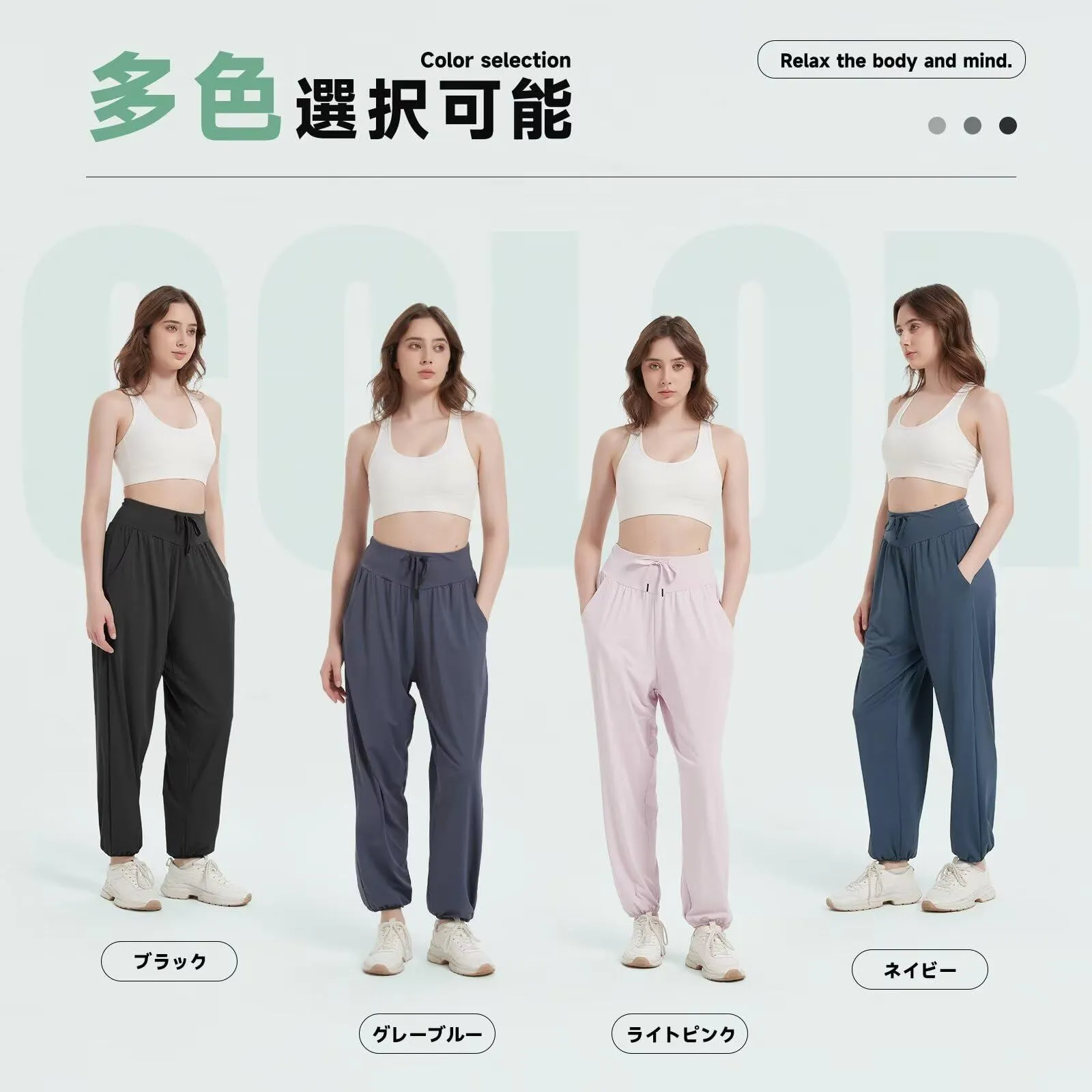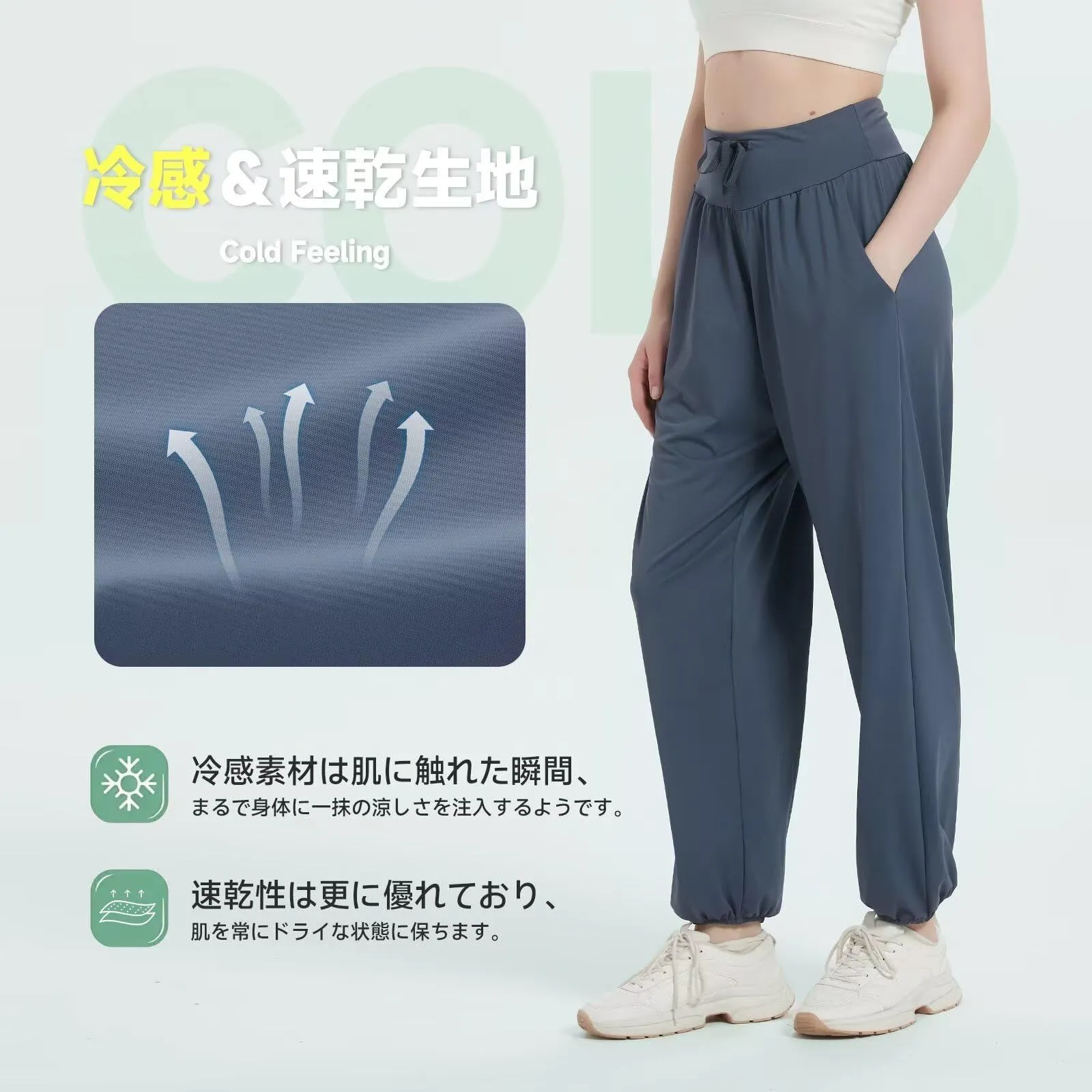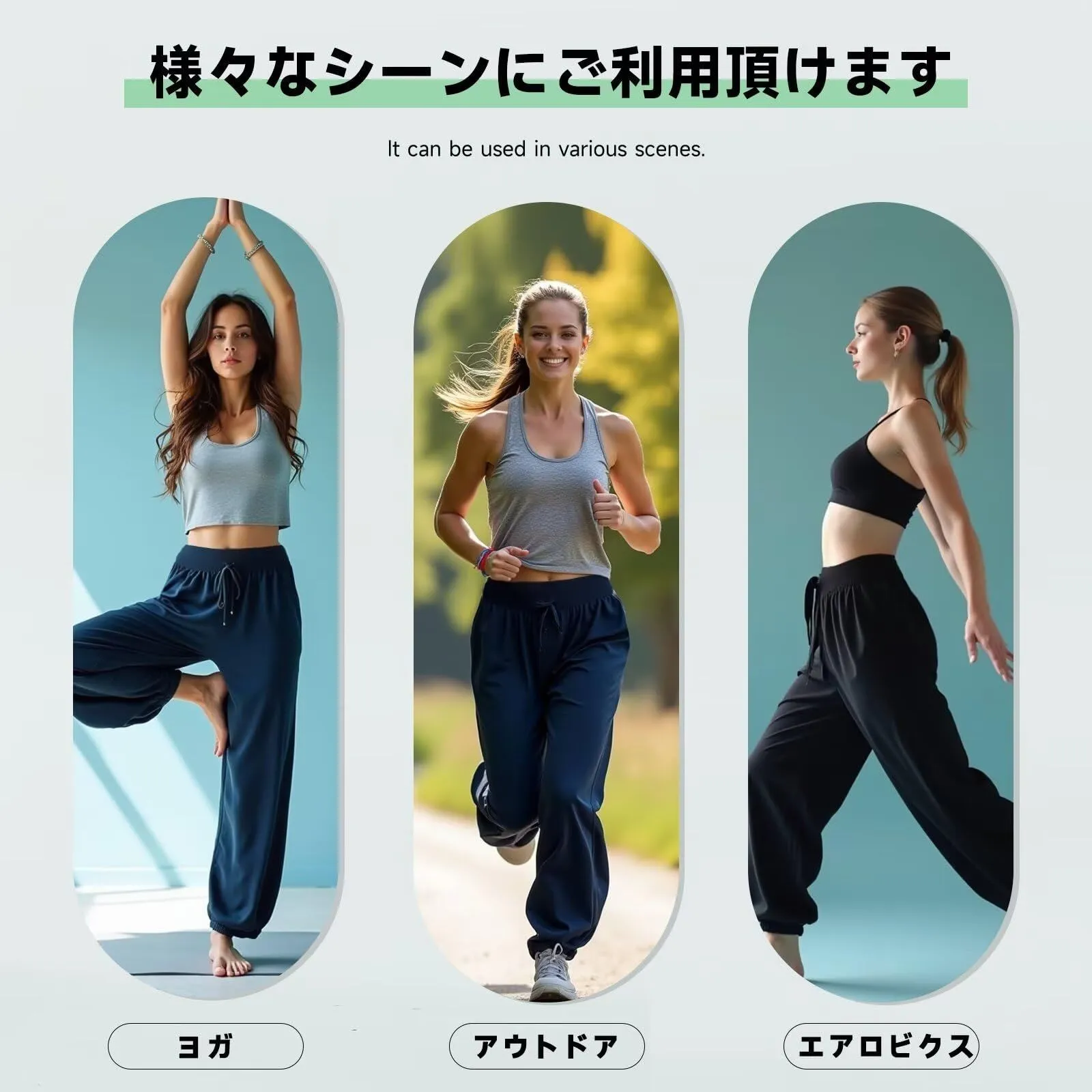 適用シーン:ウォーキング、ジョギング、エアロビクス、ヨガ、フィットネスなどのスポーツシーンはもちろん、アウトドア、通学などのカジュアルシーンやルームウェアとしても幅広くご利用いただけます。