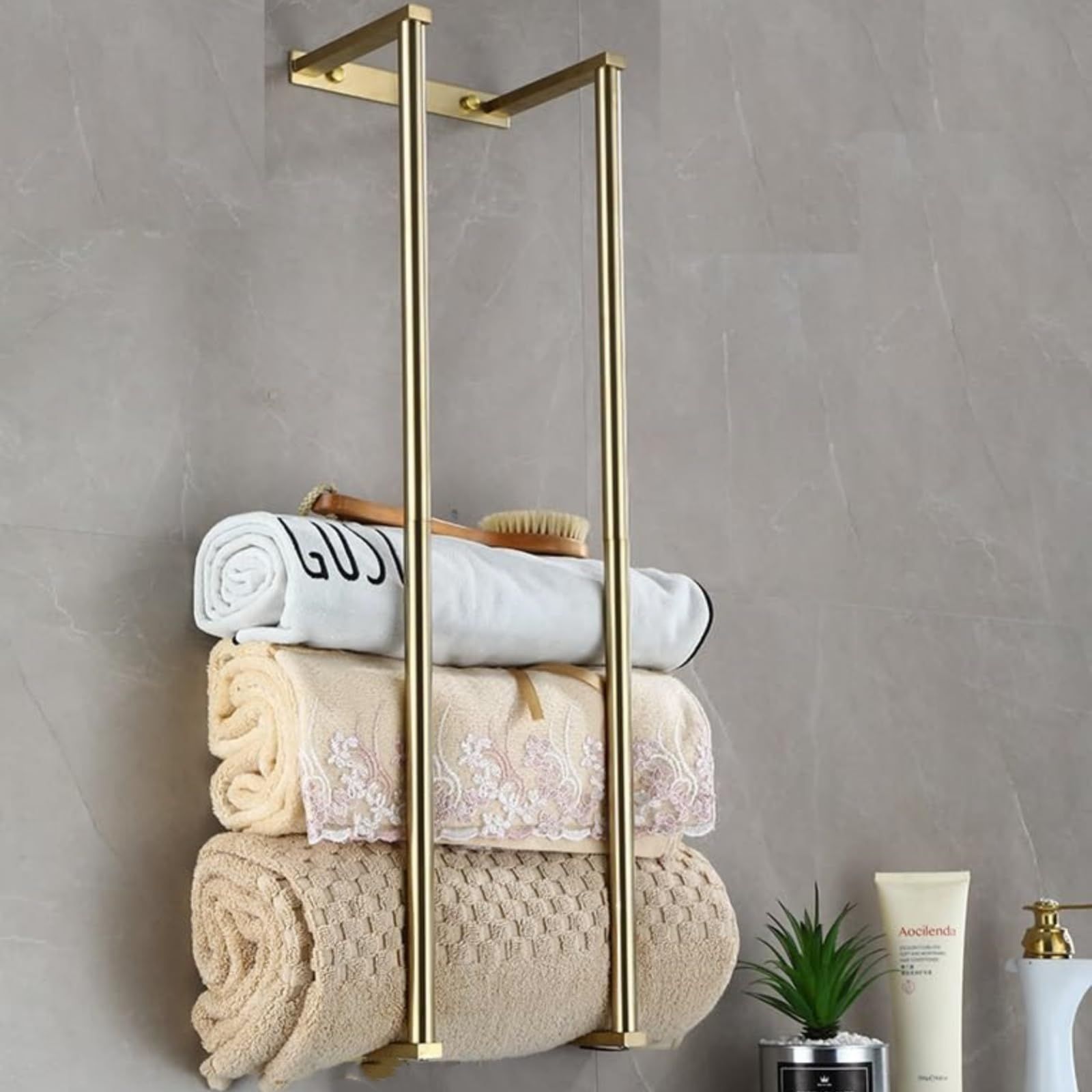 【特価商品】タオルハンガー タオル掛け バスルームタオル収納 バスタオルスタンド おしゃれ 壁取り付け 丸めて収納ランドリーラック バスタオル置き タオル収納 タオルホルダー 取り付け簡単 タオルラック 省スペース コンパクト シンプル (ゴールド)