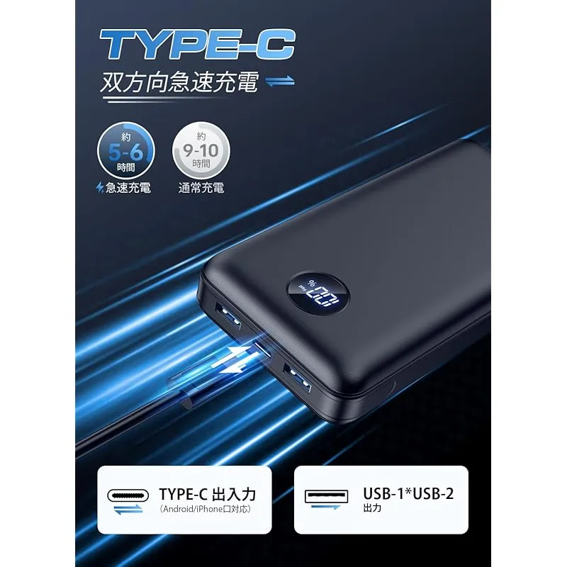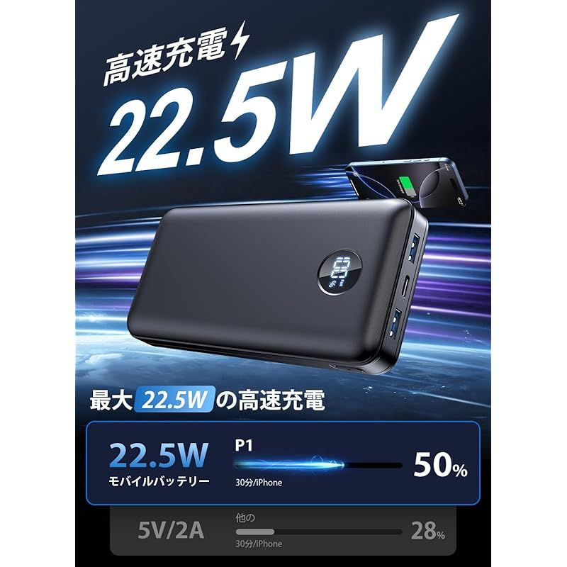 【急速充電! PD20W/SCP22.5W各種対応&3台同時充電】「P1」モバイルバッテリーは最先端の4.5A急速充電技術を採用しており、高精度・高安定度の出力電圧、出力電流を制御の活用により高効率充電を達成しました。「待ち合わせをしているのに充電が切れてしまった」といった場面でも、急速充電の機種があれば対応できるので便利です。またPower Delivery 、QuickCharge3.0等の充電規格に準拠し、USB-A/USB-B出力ポート( QC 22.5W )、Type-C出力ポート ( QC 20W ) 、を含む3種類の出力方式があって、最大22.5W出力で充電が可能、高品質なリチウムポリマー内蔵されたモバイルバッテリーは99%のデバイスと互換性があります。30分でiPhone 16を15%から54%まで充電することができます!最大4.5Aでフルスピード充電が可能、従来の5V=2Aと比べて50%充電時間を短縮できます。 ??