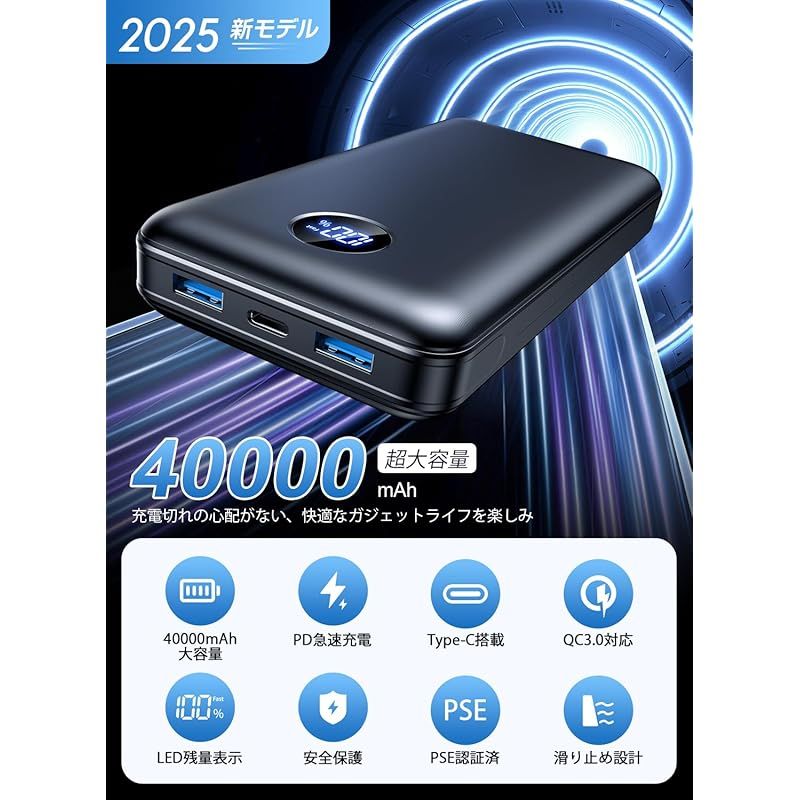 【大容量! 40000mAh安心の大容量&多場合対応可能】電子化の普及に伴い、一人で複数のデバイスを持ち歩くことが一般的な現象になってきました。しかし、緊急充電の問題は主要な研究課題となっています。弊社の40000mAhという圧倒的な大容量はこの問題を完全に解決します。40000mAhのモバイルバッテリーは、スマホと重ねて持っても負担にならないほどコンパクトなのが魅力です。スマホを約10回充電できる容量なので、丸1日の外出や手ぶらで出かけるときに活躍します。さらに、余裕の容量で 3 台のデバイスを同時に充電で、アウトドア用、宿泊旅行用、災害時には欠かせない製品となるというです。これ一つで複数台のスマホ、ワイヤレスヘッドホン、などある程度の電子機器の充電を気にしないでキャンプなどコンセントのないところへ出かけられる安心感。さらに、重量が約430g、サイズは約147.3x68.8x28.4mmと持ち運びに便利なモバイルバッテリーです。 ??