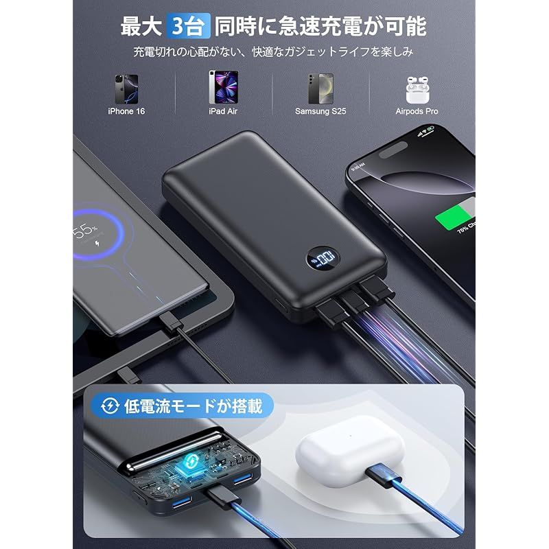 【大画面残量表示!スタイリッシュなデザイン&低電流モード搭載】本製品の電源ボタンは物理ボタンとなっており、1回押すすることで電源が入ります。大画面デジタル数値表示方式となっているのでどの程度の残量なのかが一目で視認できて、通勤するときはバッテリーの何%か分かりやすいから最高です。外形上、本品は特別な材料を選び、汚れにくく傷のつきにくいで、使いやすさとデザイン性を両立しました。それに、低電流モードも搭載しているので、動歯ブラシ、髭剃り、イヤホン、空調作業服、デジカメといった電子機器の充電も可能となっています。人々の生活をより便利にすることができます。 ??