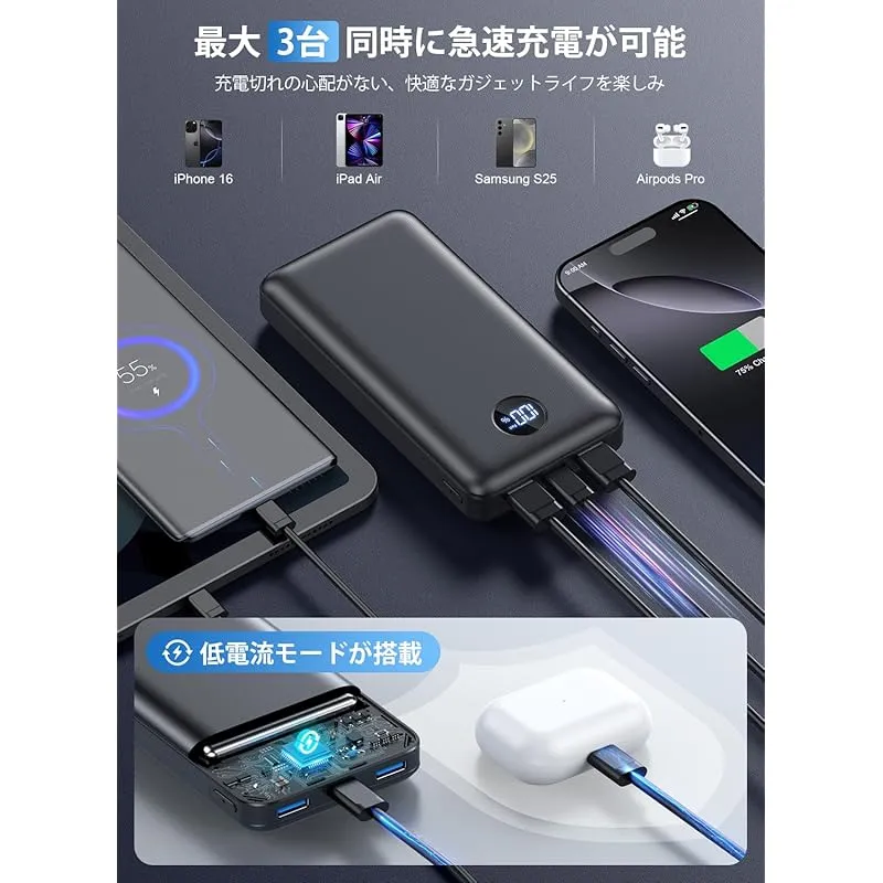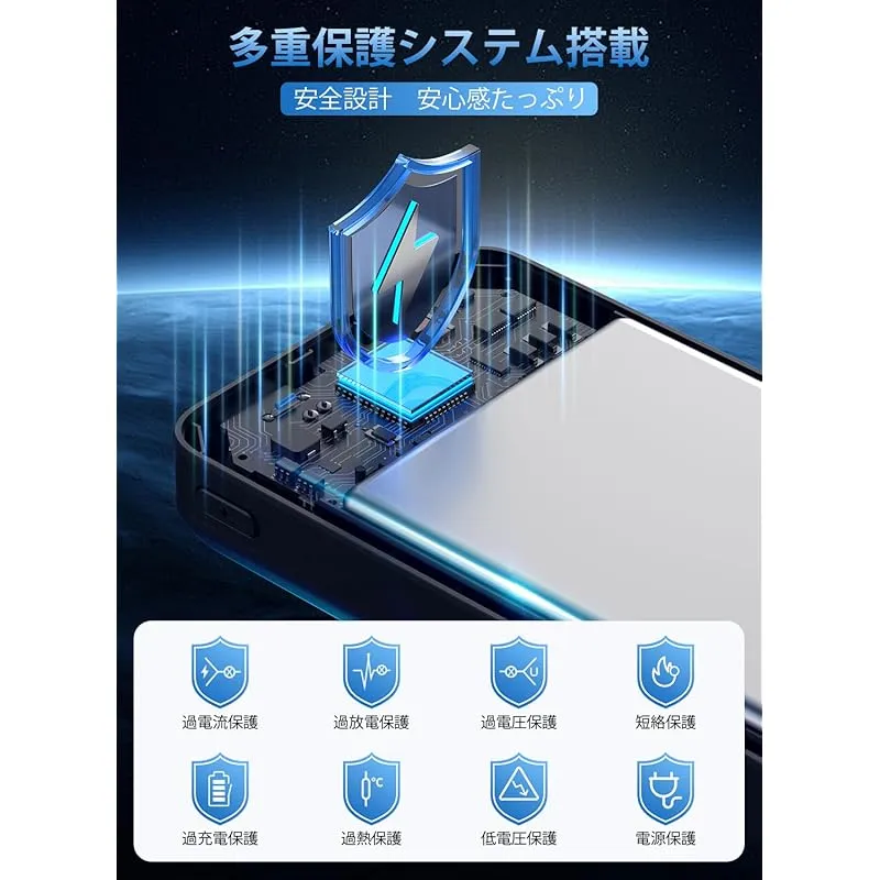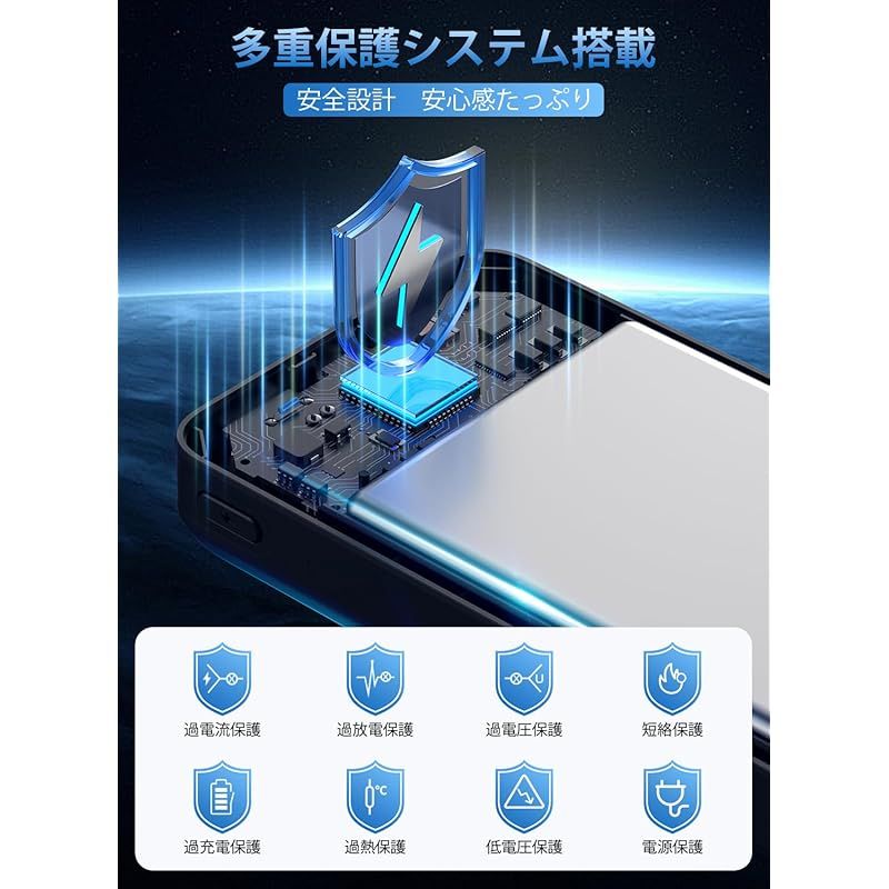 【安心利用!PSE認証適合品で多重安全保護機能つき】本製品が高性能ICチップと安全装置が内蔵されており、発熱防止に効果的なだけでなく、出力過圧保護/出力過電流保護/出力短絡保護/入力過圧保護/入力過電流保護/電池過充電保護/電池過圧保護/電池過放電保護など計多重の安全保護措置を備え、安全と性能を一体化した完璧なモバイルバッテリーです。同時に、電気用品安全法(PSE)の技術基準に適合して、安心して持ち歩くことが可能です。高品質な素材・最先端の電子基板・保護機能が採用されており、安心・安全なプレミアム設計になっています。 加えに、「まとめて充電」に対応しているのも特徴です。モバイルバッテリーとスマホがまとめて充電できるので、就寝時にセットすれば翌朝にはフル充電で出かけられます。大容量でも高品質のモデルで、生活に必要なものになります。 ??