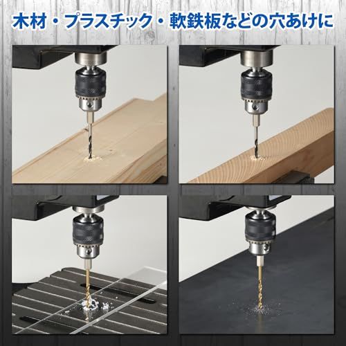 【仕様】本体(BB-100A)電圧:AC100V、周波数:50/60Hz、電流:1.2A、定格消費電力:100W、チャック能力:0.66.5mm、本体サイズ:約奥行250幅190高さ380(mm)、ベースのサイズ:約170170mm、重量:約5kg、コード長:約1.6m、定格時間:20分 チャックから支柱までの距離:約100mm、スピンドルシャフトの上下移動:約23mm、ベルト回転速度:1約4700min-1、2約3000min-1、3約2000min-1※ダイヤルスイッチにより回転速度が変わります (バイス)最大口開幅:約65mm、口の幅:約65mm、口の高さ:約20mm