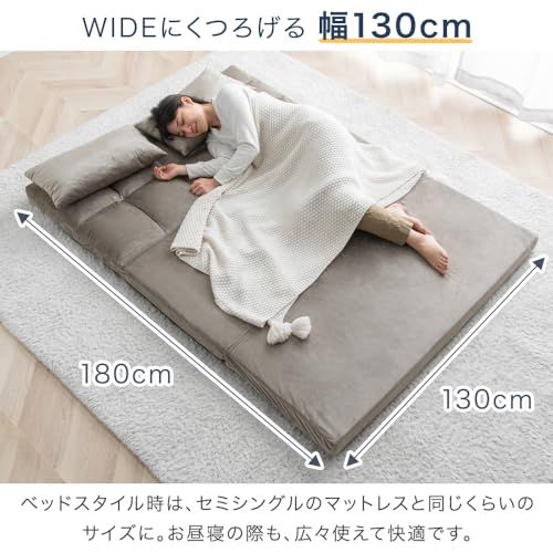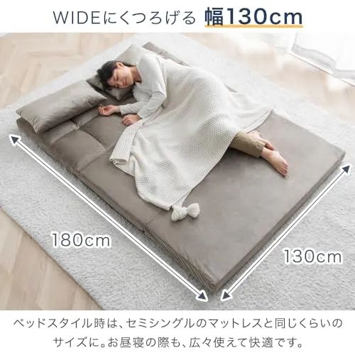 【サイズ】ソファ時:幅130奥行60高さ68cm / ベッド時:幅130奥行180厚さ8cm / クッション:幅32奥行52厚さ11cm